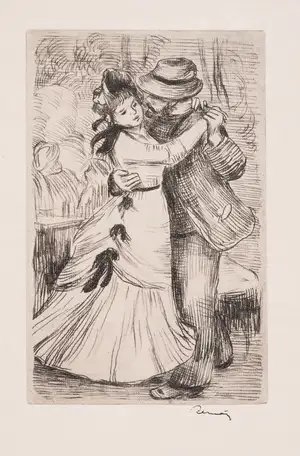 Pierre-Auguste Renoir's "La Danse à la Campagne (Delteil 2)" is a softground etching with platetone created around 1890 that captures a bucolic scene of rural celebration through the artist's refined printmaking technique. The work exemplifies Renoir's mastery of etching, employing the delicate tonal qualities characteristic of softground printing to evoke the warmth and movement of figures dancing in a countryside setting. Presented on wove paper with full margins and bearing the artist's signature stamp, this impression measures 317 by 249 millimeters and represents an important example of Renoir's graphic output during the late 19th century.