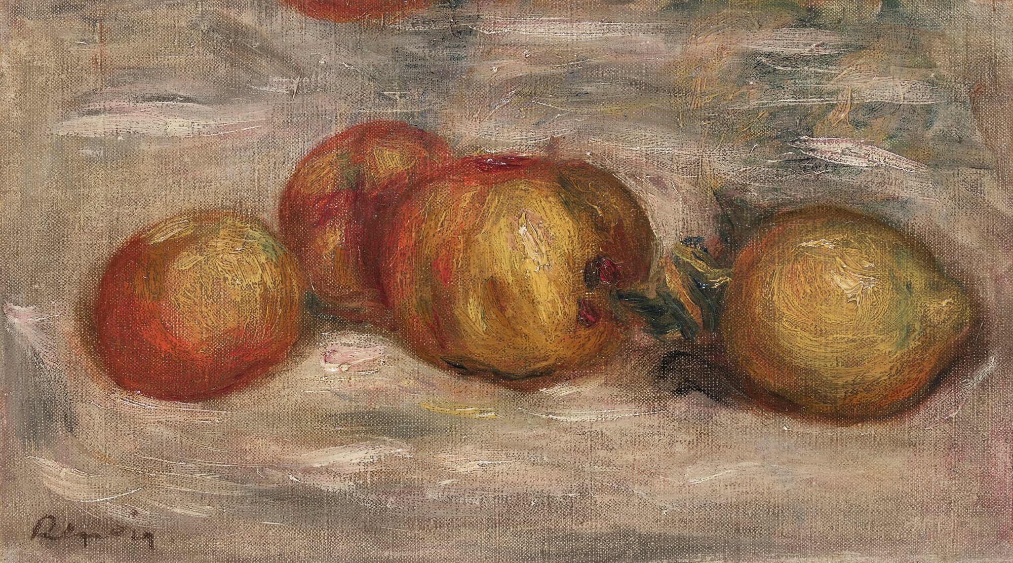 Renoir's 1913 oil painting depicts simple fruit subjects—apples and lemon—rendered with the artist's characteristic soft brushwork and luminous color. This still life exemplifies the aging Impressionist master's continued exploration of modest, everyday subjects.