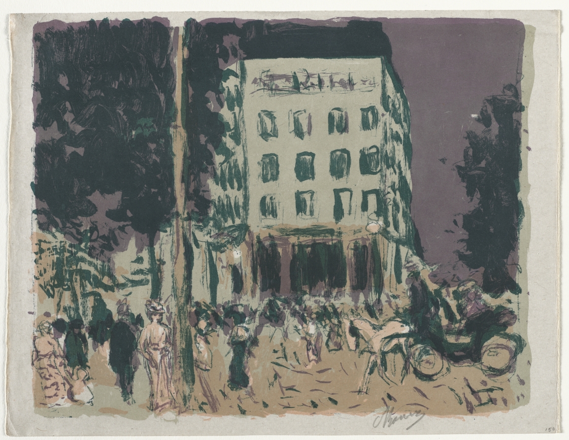 Culminating his series of Parisian street scenes, this color lithograph synthesizes Bonnard's observations of urban life with his mature printmaking technique.