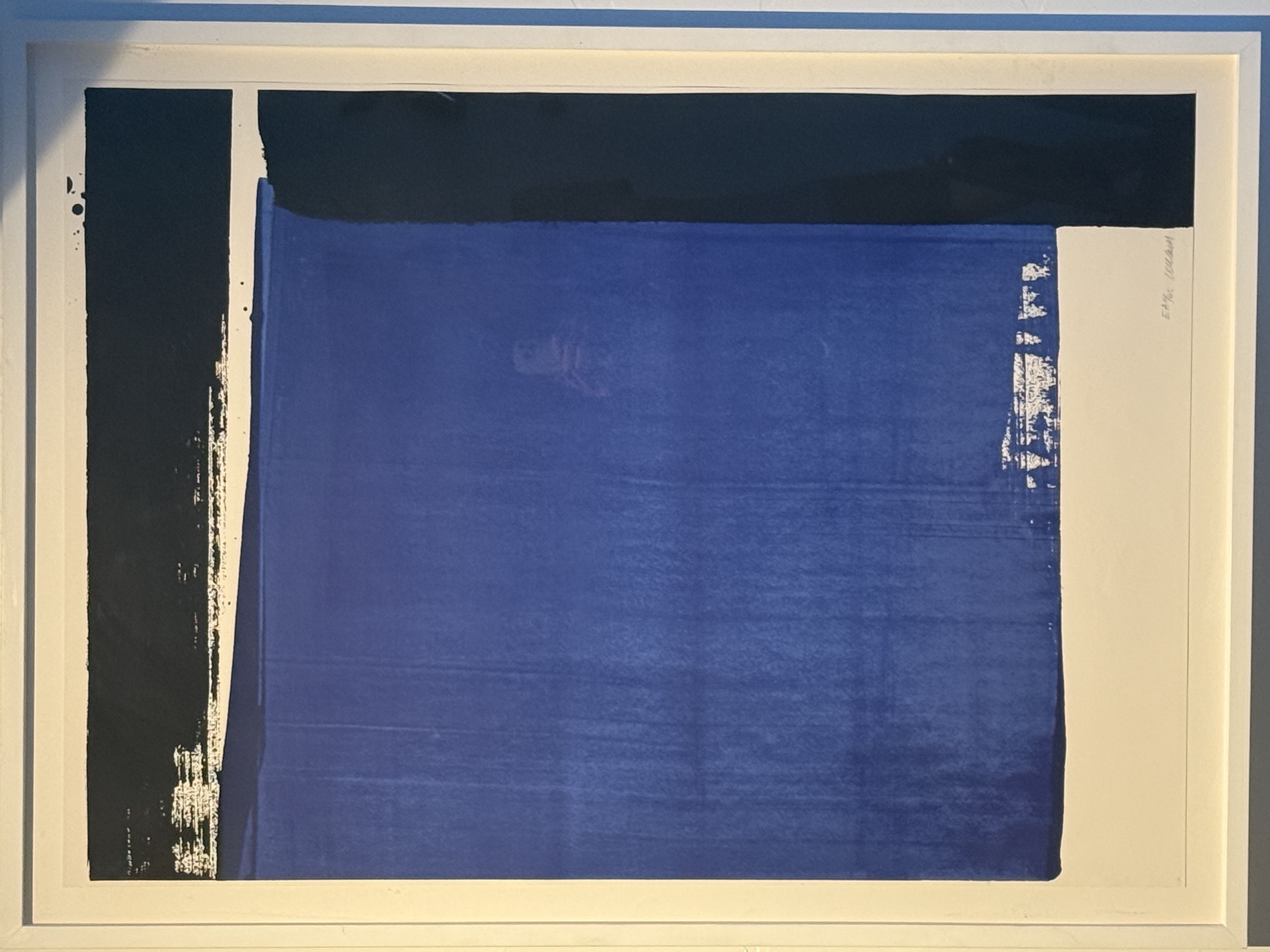 A striking signed serigraph by renowned French abstract master Pierre Soulages from 1981. The composition features bold geometric forms in deep ultramarine blue and black against white, with characteristic gestural white brushstrokes creating dynamic tension. This work exemplifies Soulages' exploration of light, darkness, and architectural space that has made him one of the most celebrated living European painters.