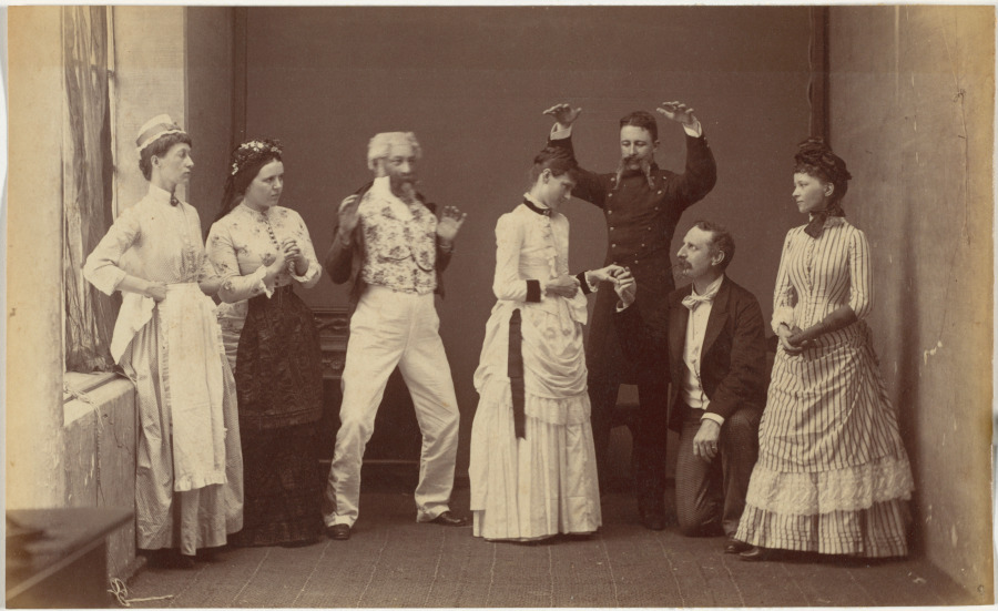Elaborate period costumes and careful staging create a theatrical tableau that captures the exotic fantasies and cultural performances of colonial social life.