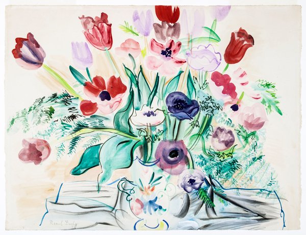 Delicate watercolor washes bring spring flowers to life through Dufy's signature technique of separating color from line, creating a sense of light filtering through petals.