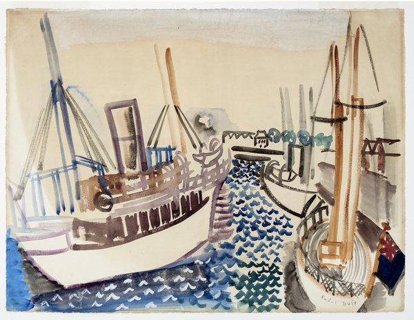 Fluid watercolor technique mirrors the gentle movement of boats at anchor, demonstrating how the medium's transparency perfectly suited Dufy's light-filled aesthetic vision.