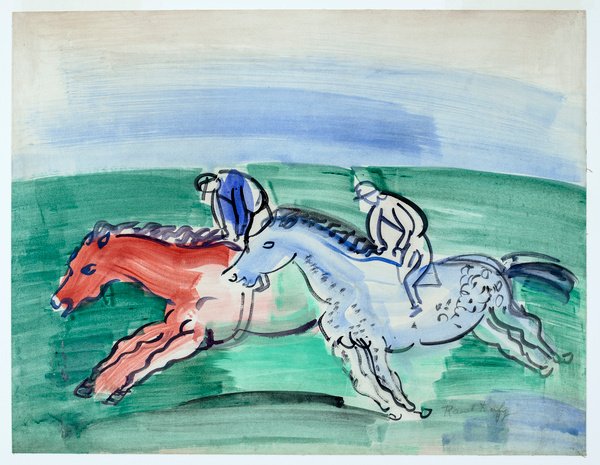 Executed in luminous watercolor washes, this equestrian scene embodies Dufy's fascination with speed and movement, subjects that defined much of his work in the 1930s.