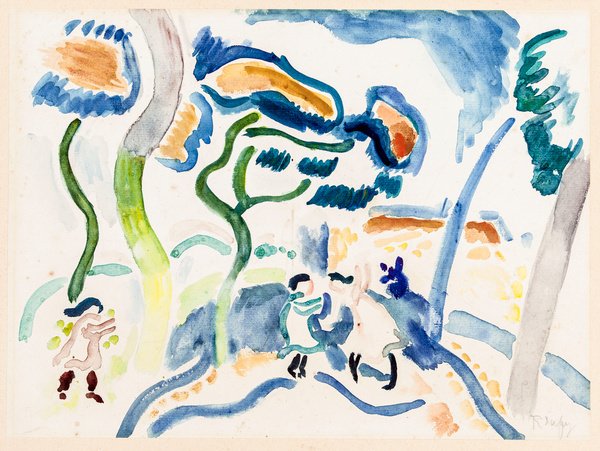 Spontaneous watercolor technique brings childhood play to life, created during Dufy's Fauvist period when he embraced bold color and expressive brushwork.