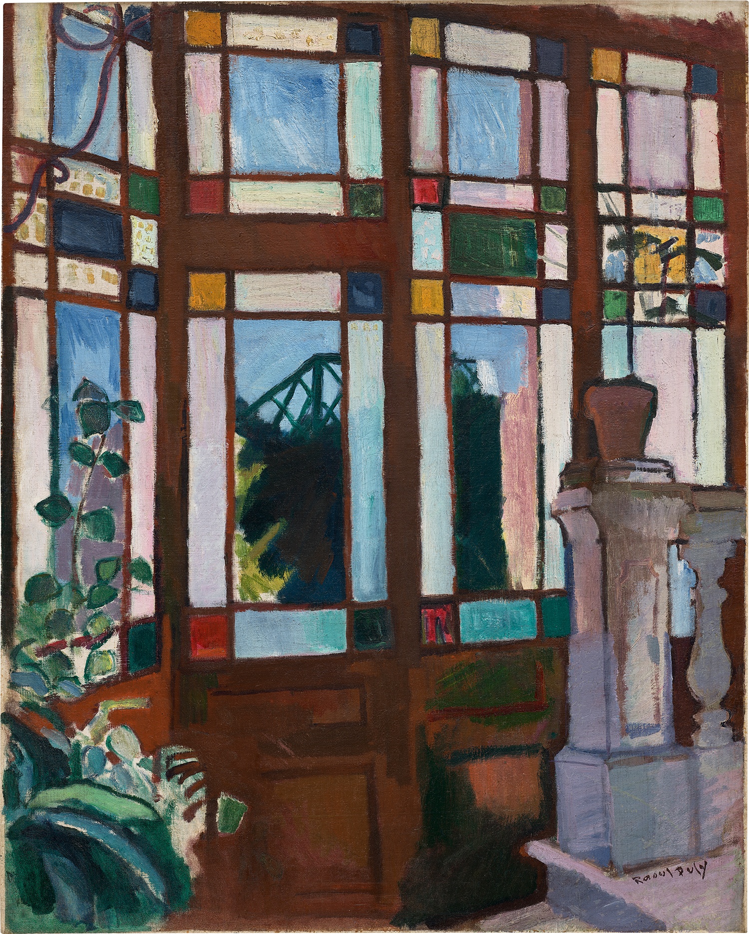 A vibrant and dynamic composition painted in 1907, this oil on canvas by Raoul Dufy depicts a window with colored panes of glass, capturing the interplay of light and hue filtering through the translucent surfaces. Created during a period when Dufy was deeply influenced by Fauvism, the work showcases bold, expressive brushwork and a rich, jewel-toned palette. The window motif serves as a framing device that transforms ordinary domestic space into a celebration of pure color and luminous intensity.