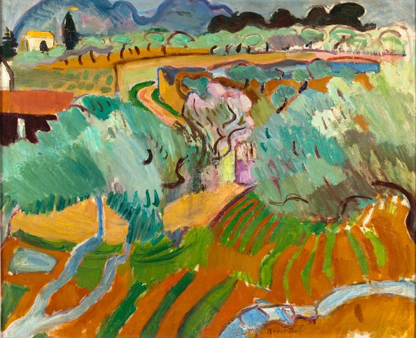 Early Fauve experimentation transforms the Provençal countryside into bold patches of non-naturalistic color, marking a pivotal moment in the artist's stylistic evolution.
