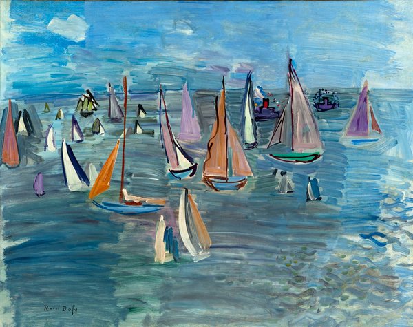 Characterized by Dufy's signature decorative style, the composition captures the excitement and movement of sailing competitions through bold, rhythmic brushstrokes.