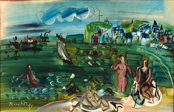 Vibrant blues and sandy yellows evoke the leisurely atmosphere of the Norman coast, where Dufy frequently painted scenes of bourgeois seaside recreation.