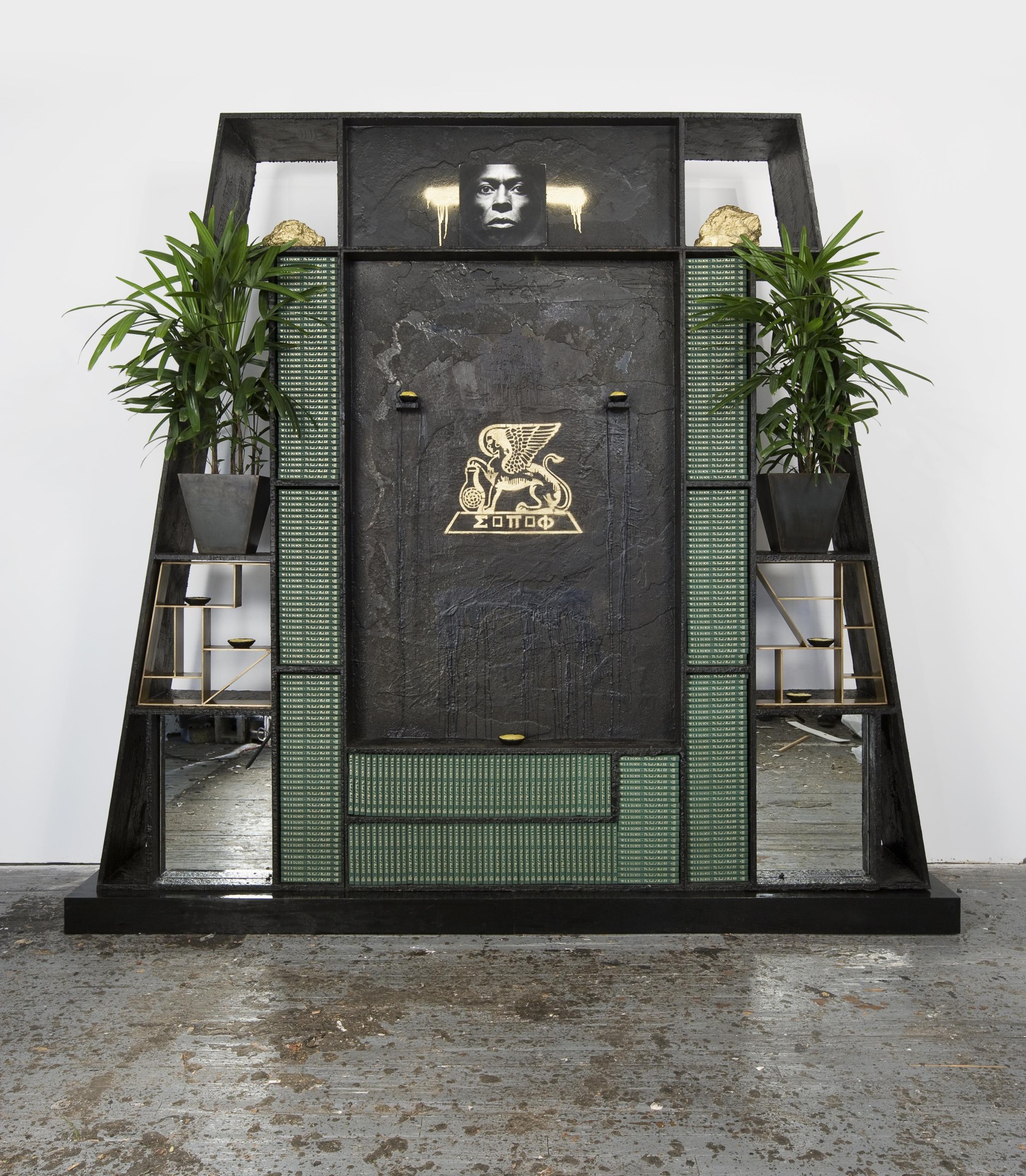 Rashid Johnson's 2010 mixed-media installation combining black soap, books, vinyl, plants, and various materials to create a complex exploration of Black identity and culture. The work uses everyday and symbolic objects to address historical and contemporary themes.