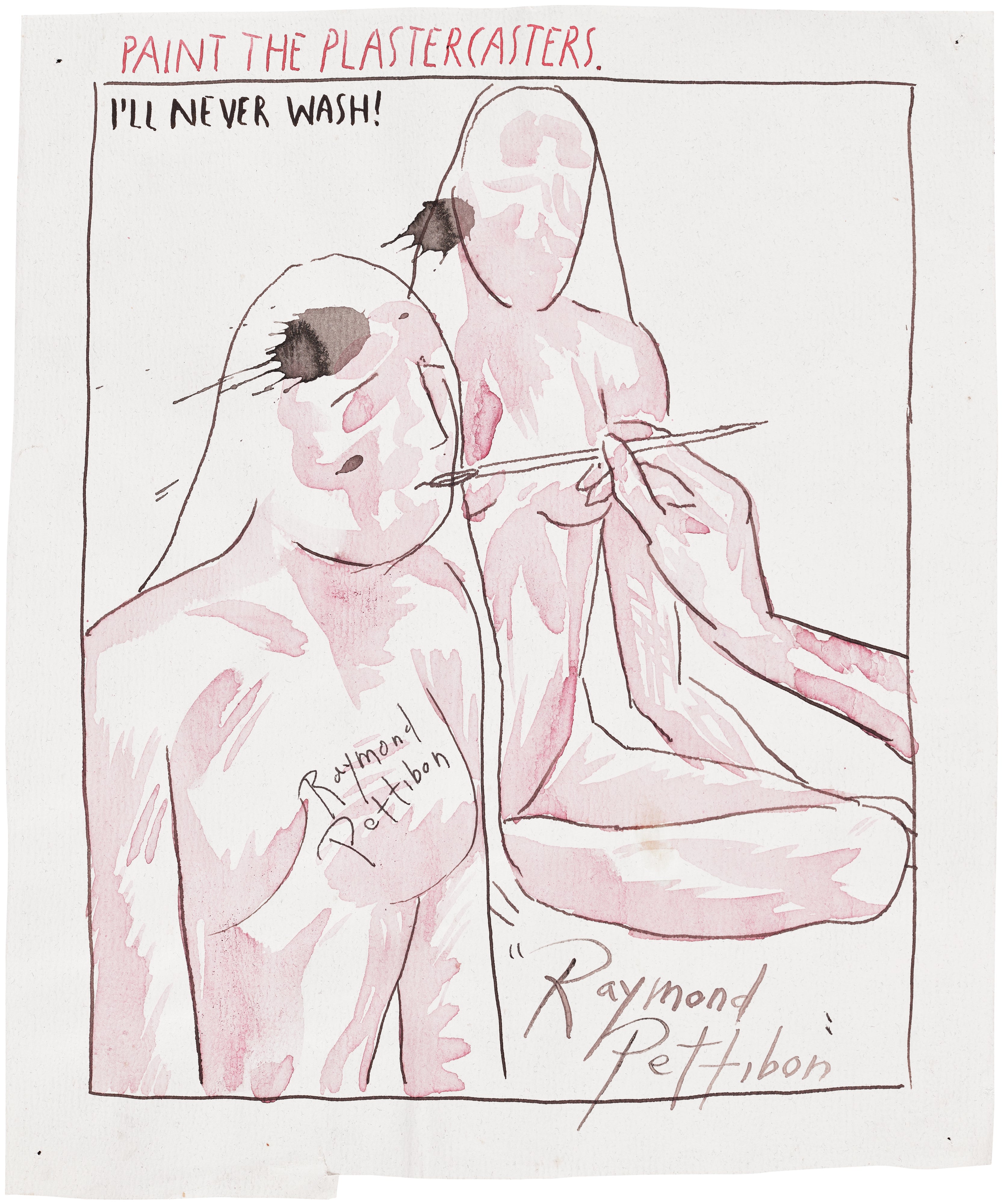 A dynamic ink drawing by Raymond Pettibon, rendered in bold, expressive lines and washes of color on wove paper, characteristic of the artist's distinctive graphic style. The work blends raw, gestural mark-making with Pettibon's signature integration of imagery and text, reflecting his roots in punk culture and his ongoing exploration of American mythology, desire, and disillusionment. This unique piece exemplifies Pettibon's ability to charge seemingly spontaneous compositions with layered psychological and cultural meaning.