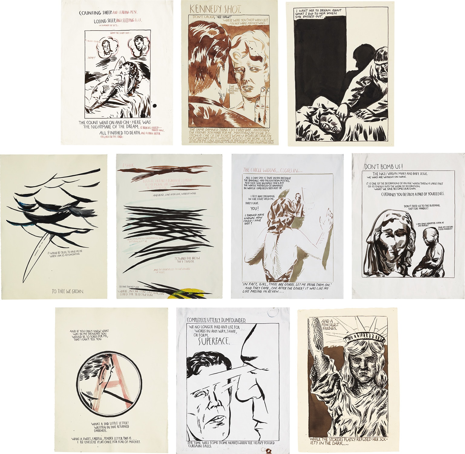 Raymond Pettibon's 'Ten works: (i-x)' is a series of works from 1985 executed in pen, watercolor, and ink on paper. This multi-part piece showcases Pettibon's distinctive style combining drawing, text, and image. The works reflect the artist's engagement with narrative, visual culture, and underground aesthetics.