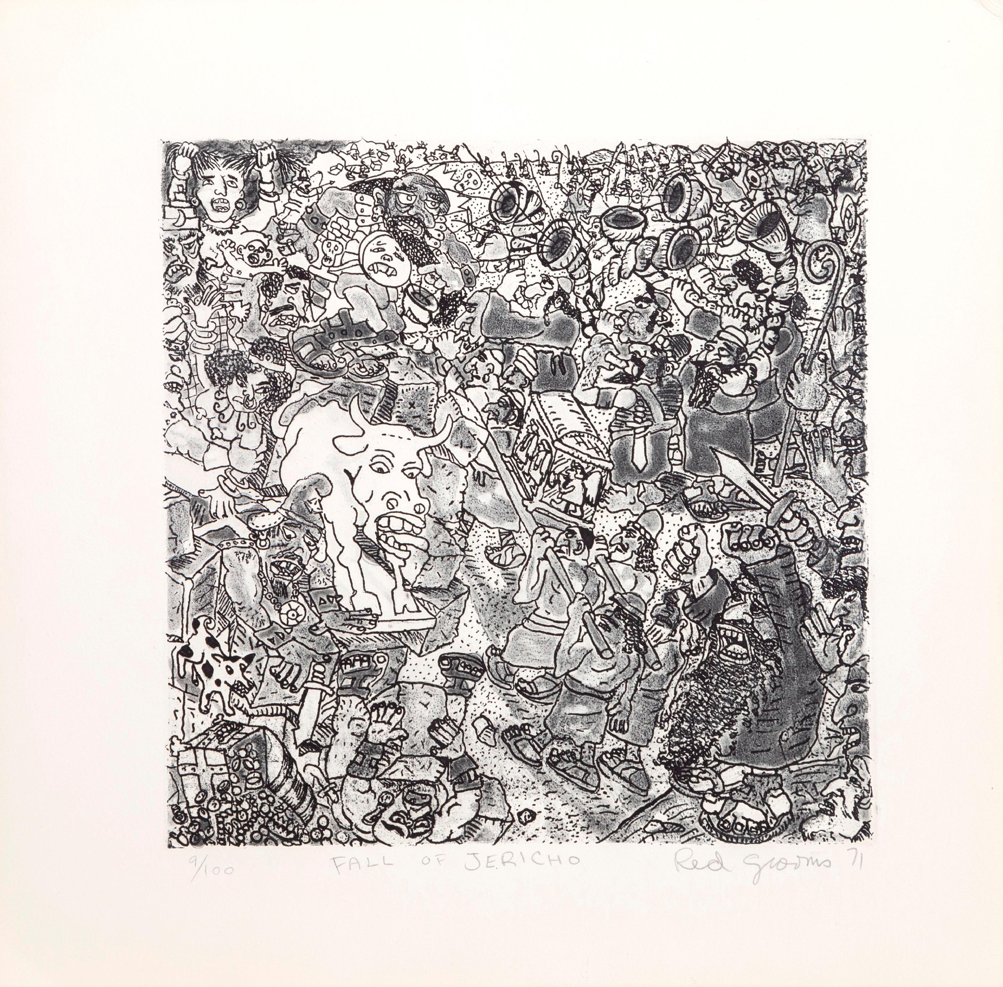 Red Grooms's "Fall of Jericho" is an etching with aquatint that captures the biblical siege with the artist's characteristically exuberant and gestural style. The print employs dynamic linework and tonal variations created through aquatint to convey the dramatic moment when the walls of Jericho collapse, translating Grooms's energetic approach to printmaking. The composition reflects Grooms's interest in historical narrative rendered through expressive mark making rather than literal representation.