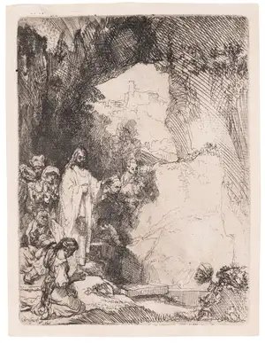 Rembrandt's "The Raising of Lazarus: Small Plate" is a masterfully executed etching with drypoint from 1642 that captures the miraculous biblical moment with dramatic intensity characteristic of the artist's mature work. This second state impression demonstrates Rembrandt's virtuosity in the printmaking medium, utilizing plate tone to create atmospheric depth and emphasize the spiritual significance of Christ's resurrection of Lazarus. The composition's intimate scale, measuring approximately 147 by 111 millimeters, belies the emotional power and compositional complexity Rembrandt achieved through his expert handling of light, shadow, and figural arrangement.