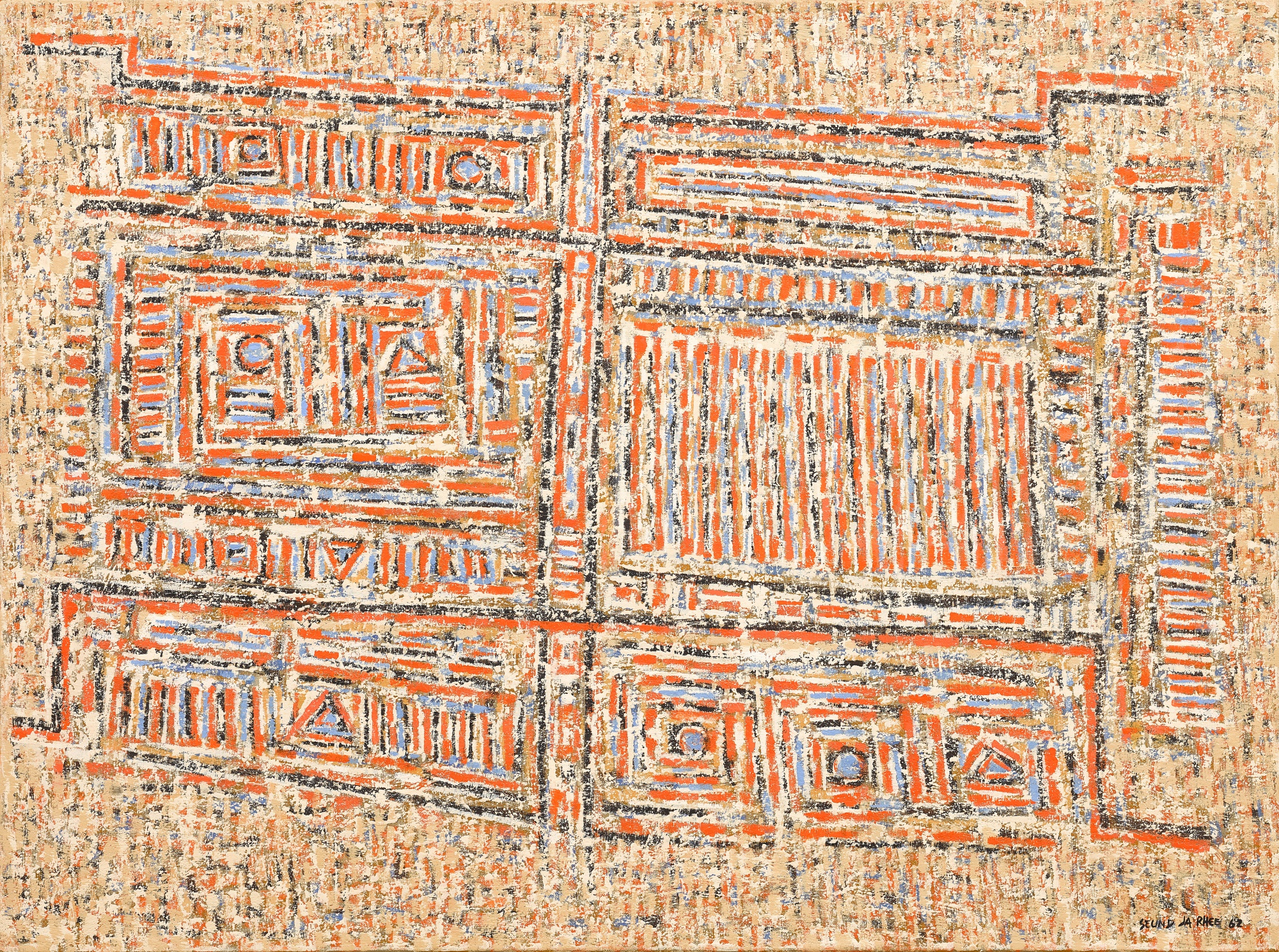 "Ceci s'accomplira 這將會實現" (This Will Come to Pass) is an oil painting by Korean artist Rhee Seundja that bridges Eastern and Western artistic traditions through its bilingual title in French and Chinese. The work exemplifies the artist's characteristic style, which often incorporates abstract forms and gestural brushwork to explore themes of transcendence and spiritual aspiration. Created in oil on canvas, the painting reflects Seundja's lifelong engagement with abstraction and her role as a significant figure in contemporary art who moved between Seoul, Paris, and the international art world.