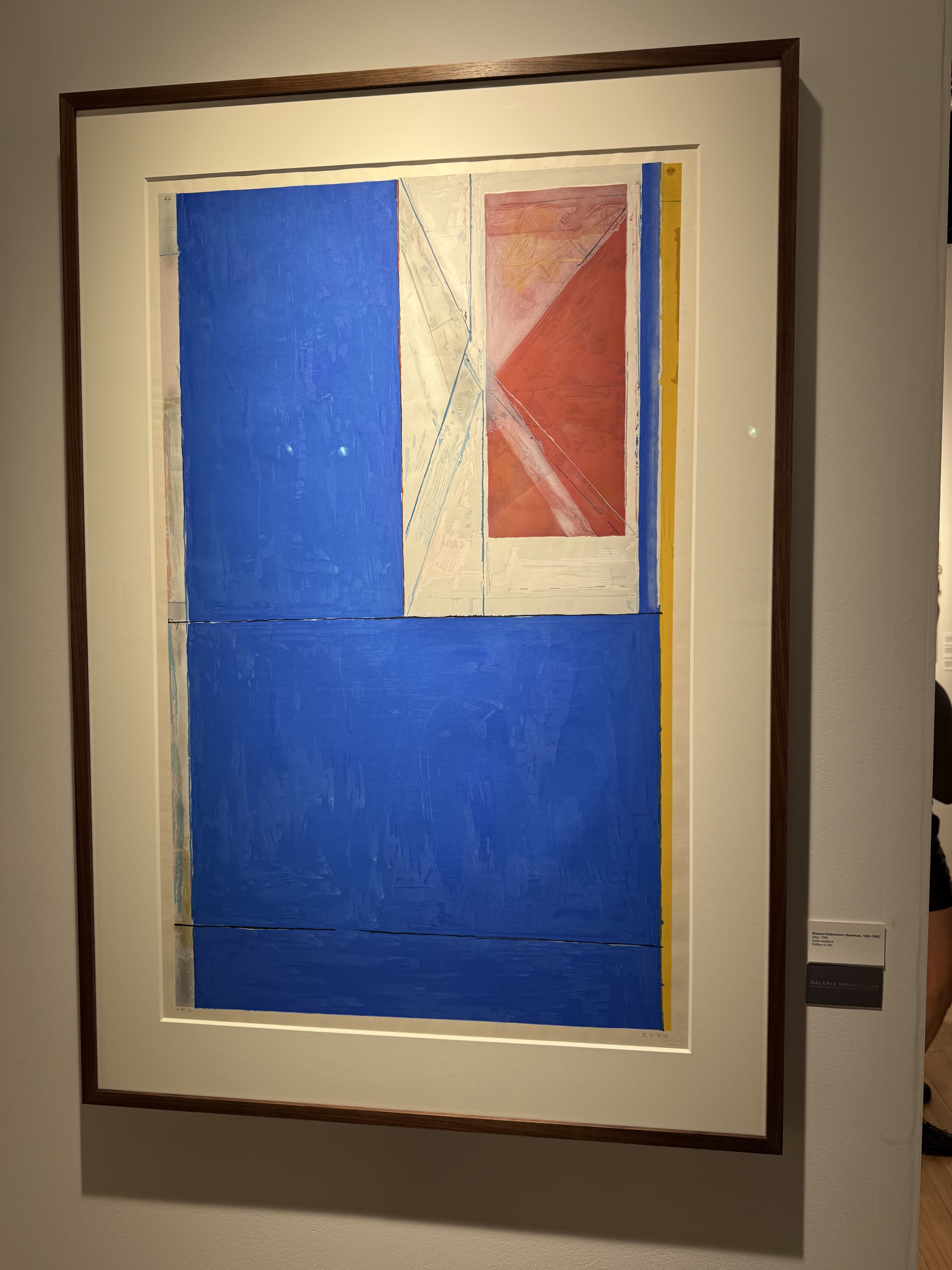 This vibrant color woodcut by Richard Diebenkorn features bold, expansive fields of cobalt blue anchored by geometric forms in white, red, and golden yellow. The composition reflects Diebenkorn's celebrated Ocean Park series sensibility, translated into the printmaking medium with characteristic mastery of planar abstraction and color relationships. Part of a limited edition of 200, this work demonstrates the artist's ability to evoke depth and luminosity through flat, intersecting color planes. It is a highly collectible example of Diebenkorn's printmaking practice from the final decade of his career.