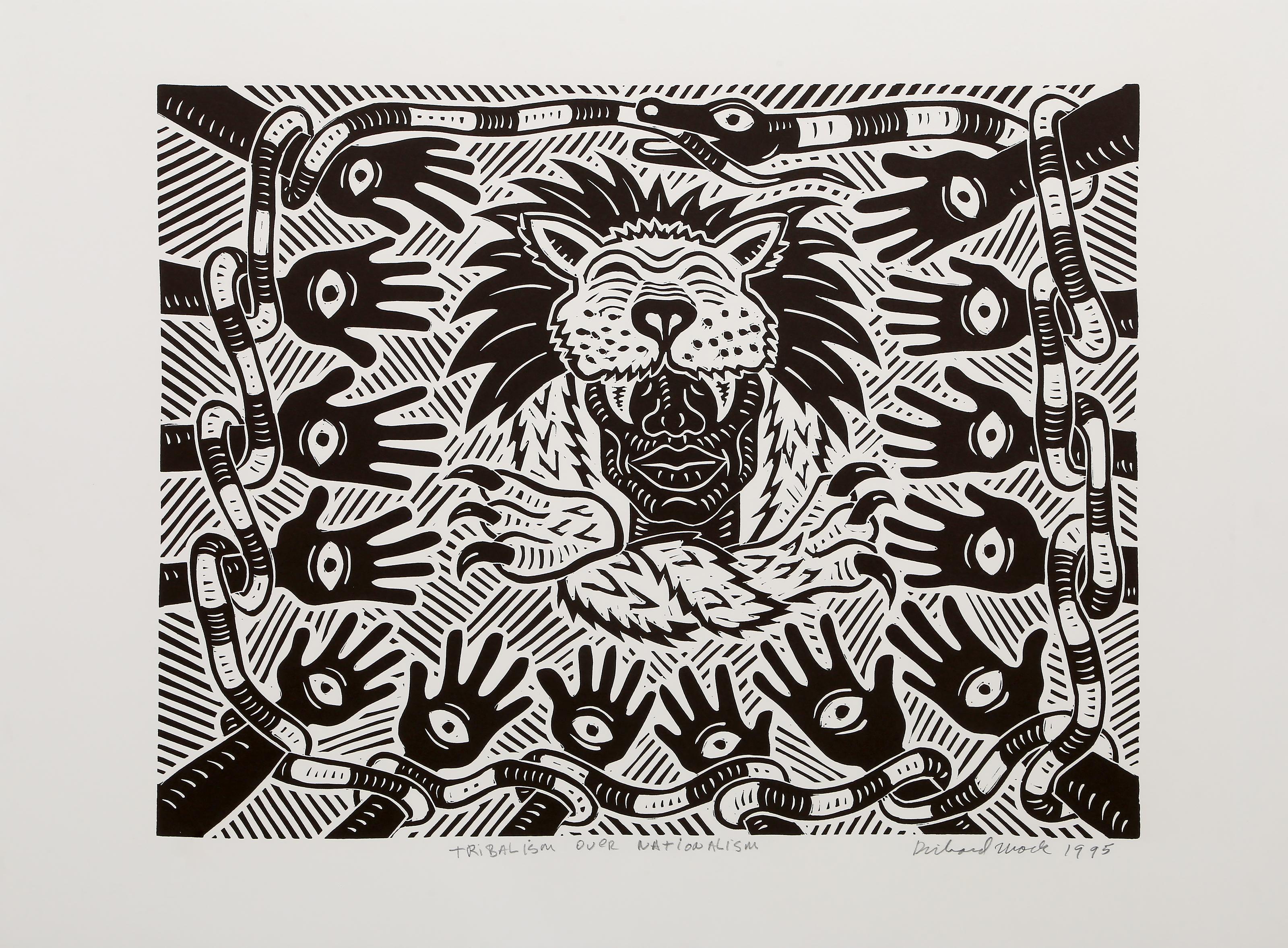 I don't have reliable information about a specific artwork titled "Tribalism Over Nationalism" by Richard Mock in linocut medium in my training data. Rather than provide potentially inaccurate details, I'd recommend verifying the title, artist name, and medium through museum collections, art databases, or the artist's official documentation to ensure you receive accurate information about this work.