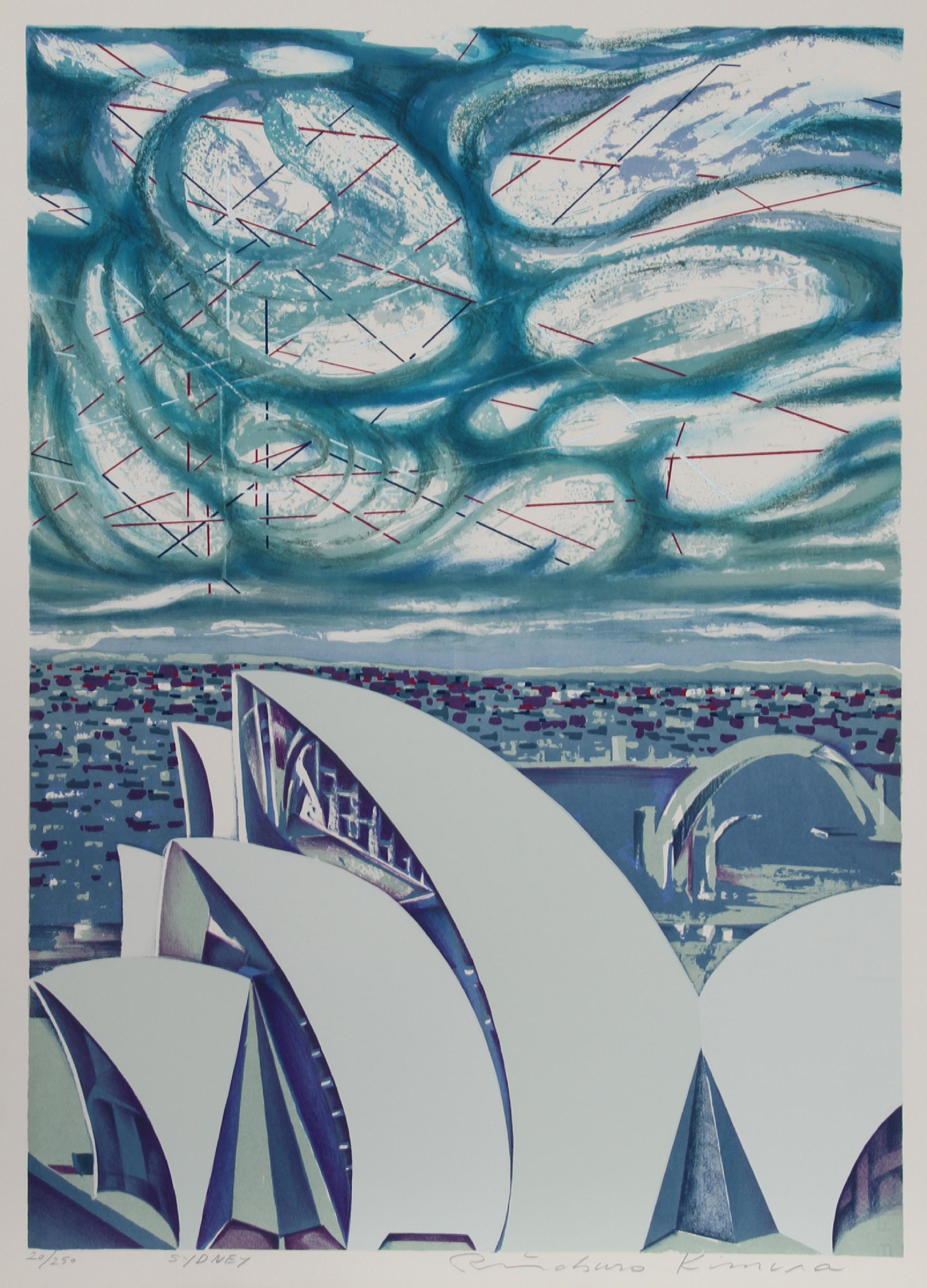 I don't have reliable information about a specific screenprint titled "Sydney" by Risaburo Kimura in my training data. To provide you with accurate, art-literate commentary about this work, I would need to verify details about the artist, the piece's date, dimensions, edition, and its visual characteristics. I'd recommend consulting museum collections, gallery records, or the artist's catalogue raisonné for factual information about this screenprint.