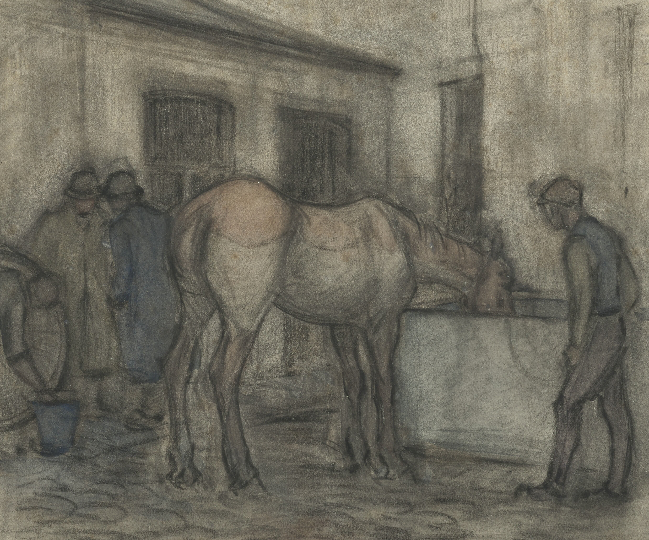 Robert Bevan's "A Cab Yard" depicts a working class London scene with horses and cabs rendered in the artist's characteristic Post Impressionist style, employing bold colors and simplified forms to convey both the energy and documentary quality of urban life. Painted in the early 20th century, the work reflects Bevan's interest in capturing modern British subjects with an expressionistic sensibility rather than realistic detail. The composition demonstrates his skillful use of color harmonies and structural composition to transform an ordinary street scene into a compelling artistic statement.