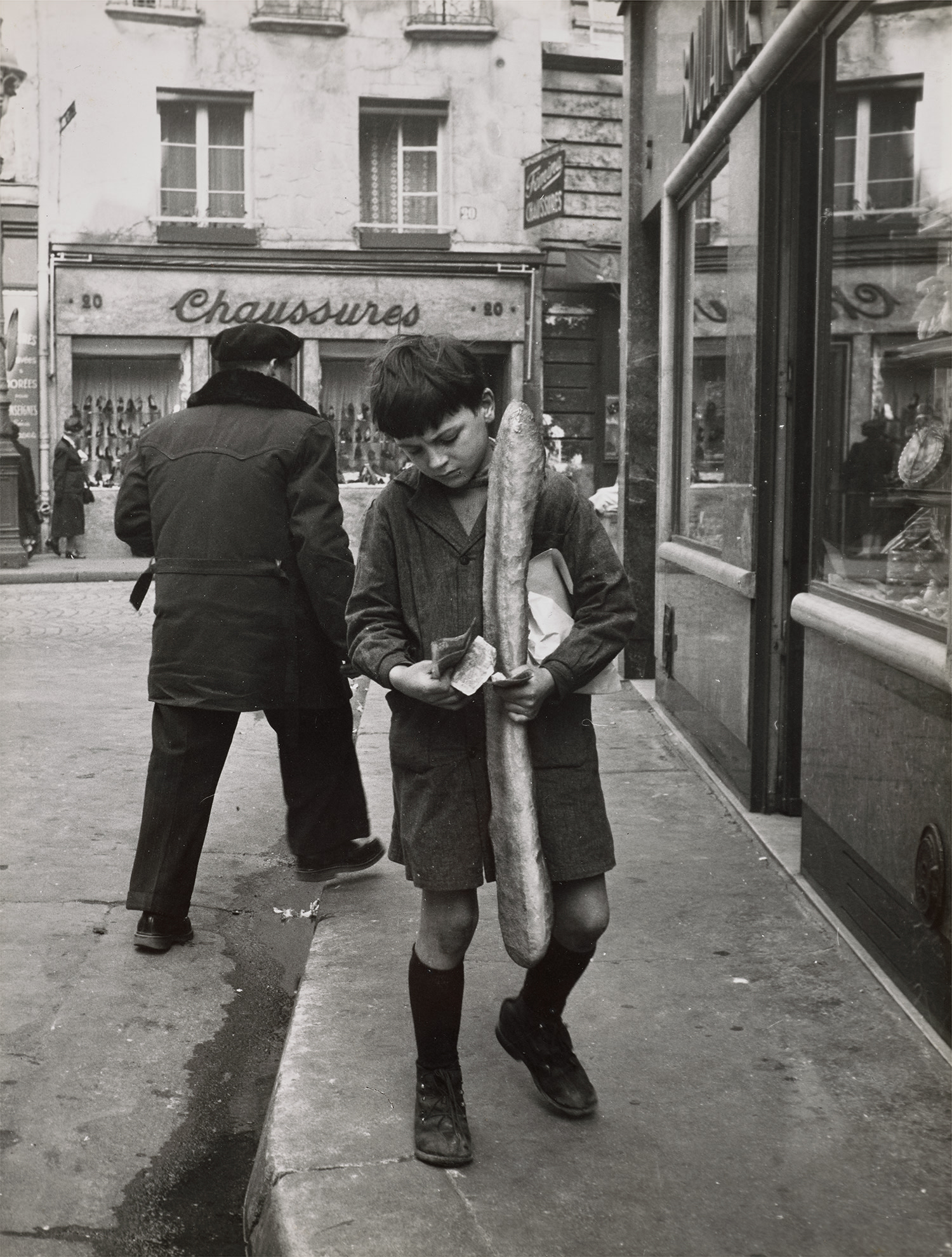 Robert Doisneau's gelatin silver print capturing the iconic Parisian baguette in everyday life. The photograph embodies Doisneau's warm, humanistic approach to street photography and French culture.