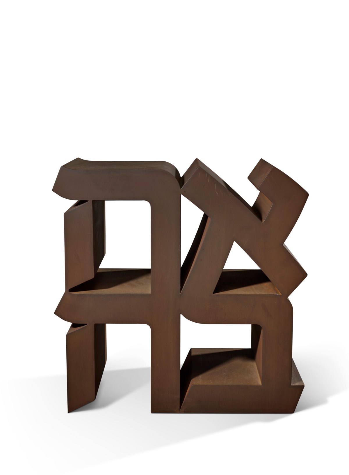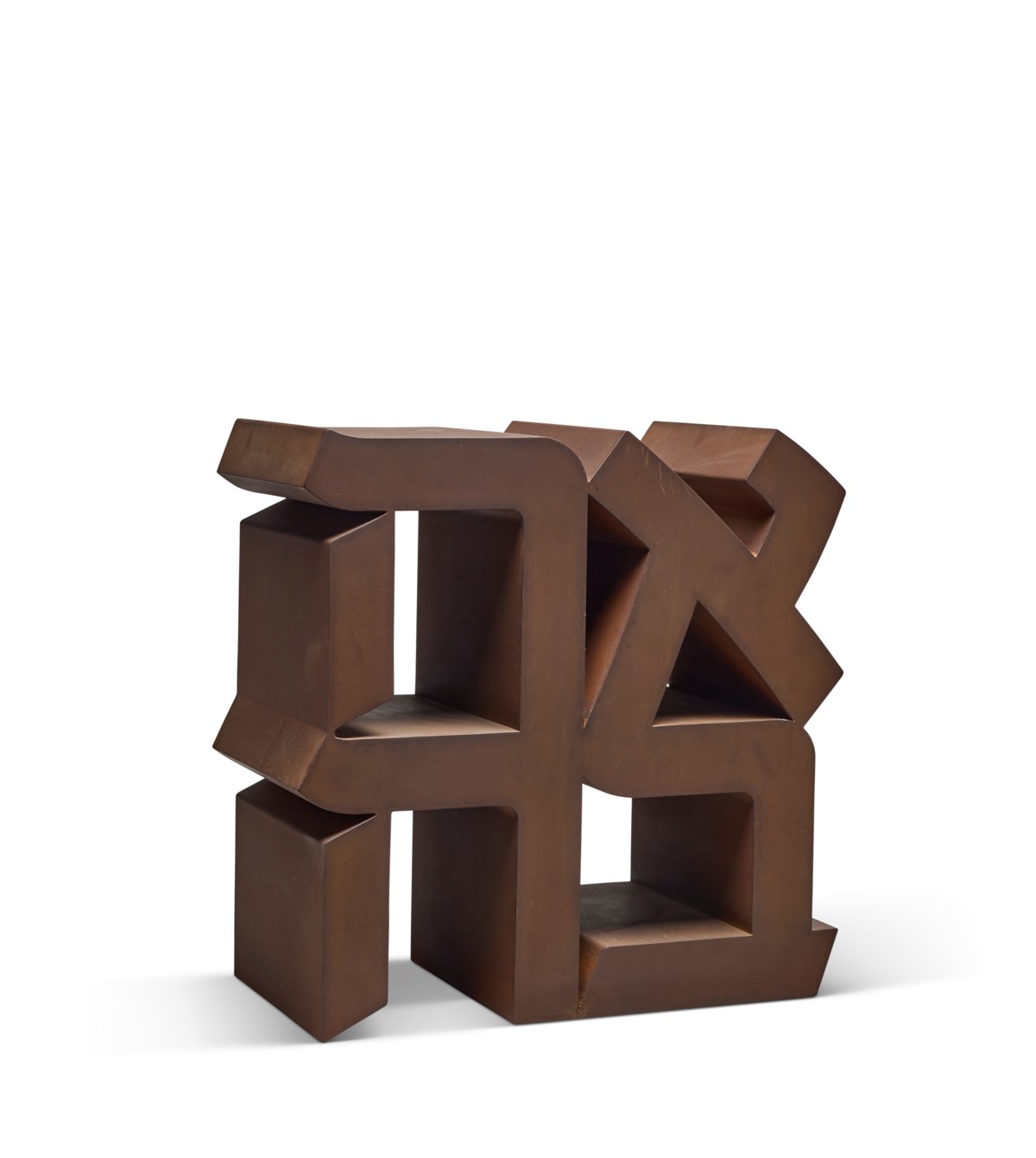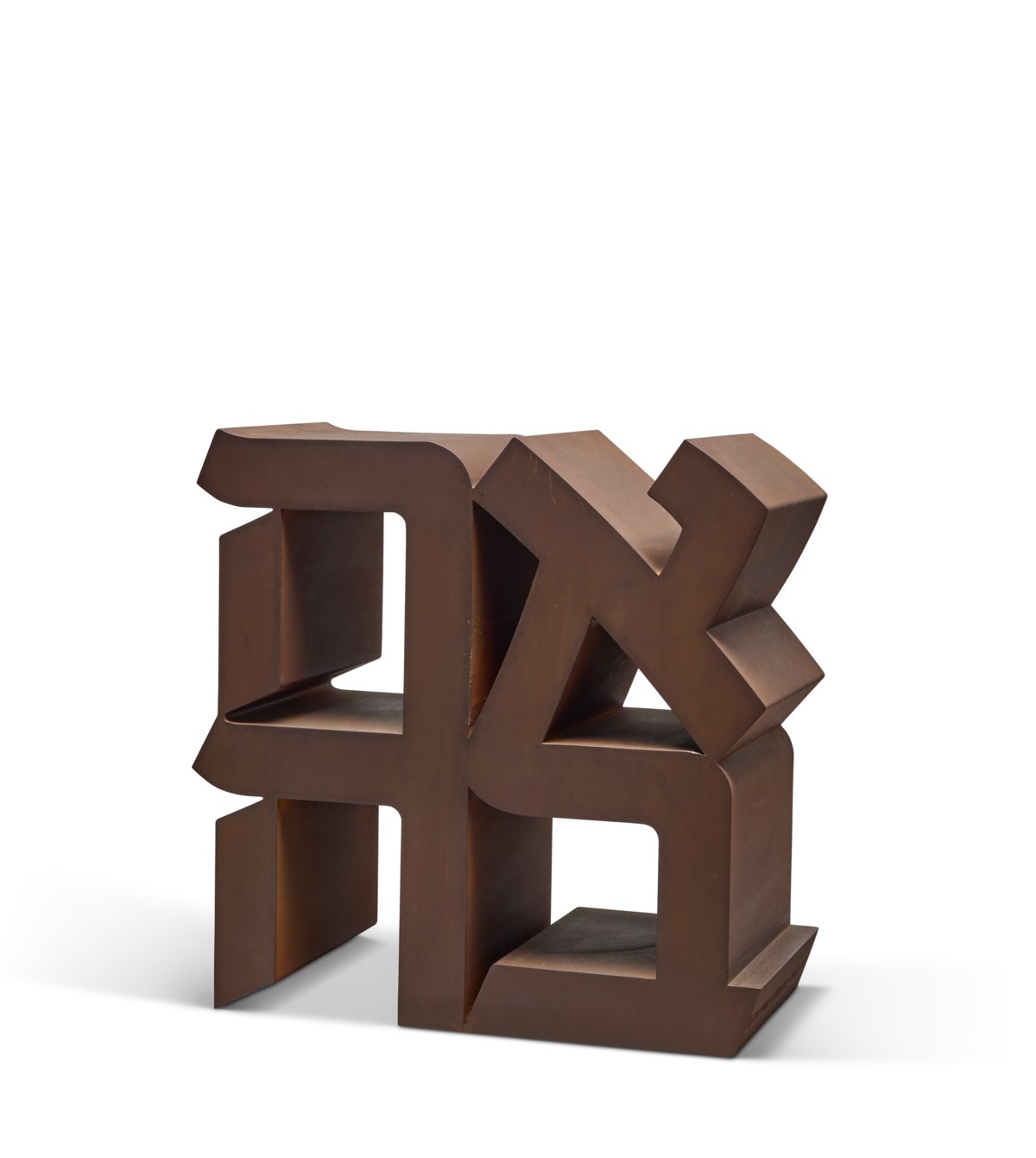 LITERATURE S. Salama-Caro, The Robert Indiana Catalogue Raisonné, digital, en cours, No. E-1977-1 (un autre exemplaire illustré). EXHIBITED Zurich, Galerie Gmurzynska, Robert Indiana: A Retrospective, novembre 2007-janvier 2008 (un autre exemplaire exposé). Conditions of sale Brought to you by Elisabetta Vitullo Junior Specialist, Head of Day Sale EVITULLO@CHRISTIES.COM +33 (0)1 40 76 85 68 LOT ESSAY Skip to main content FRANÇAIS ENGLISH En 1977, Indiana conçut une nouvelle déclinaison de son iconique sculpture LOVE, intitulée AHAVA, substituant au mot anglais le terme hébreu désignant l'amour, tout en conservant la même composition quadripartite caractéristique qu'il avait élaborée au milieu des années 1960. L'œuvre illustre avec éloquence la singularité de sa démarche sculpturale, transposant le mot écrit en deux dimensions en une sculpture monumentale aux arêtes franches et rigoureusement traitées. Indiana réalisa une version en acier Cor-Ten de près de quatre mètres de hauteur et en fit don au Musée d'Israël à Jérusalem. L'œuvre y est mise en valeur de façon saisissante dans le jardin de sculptures dessiné par Isamu Noguchi, où la patine brun rouille de l'acier contraste avec le bleu azur du ciel, instaurant un dialogue puissant entre le terrestre et le céleste, évoquant deux dimensions distinctes de l'amour. AHAVA, œuvre-hommage dédiée à la mémoire de l'évêque James A. Pike, met en lumière l’importance de la dimension spirituelle de l’amour dans l’œuvre d’Indiana. Pike, disparu dans le désert israélien, et auprès de qui Indiana a travaillé à la Cathédrale Saint-Jean-le-Divin à New York, a joué un rôle déterminant dans l’engagement de l’artiste et dans son approche du thème de l’amour. Dans AHAVA, la superposition des lettres selon une disposition en deux par deux, séparées par une ligne verticale plutôt qu’horizontale, souligne le lien entre divinité et amour. In 1977 Indiana conceived a new version of his iconic LOVE sculpture, AHAVA, using the Hebrew word for “love” in the same distinctive quadripartite composition that he had developed in the mid-1960s. The work embodies Indiana’s unique approach to sculptural form, translating the two-dimensional written word into a monumental sculpture with precisely rendered hard edges. Indiana created a 12-foot high Cor-Ten steel version of AHAVA as a gift for the Israel Museum in Jerusalem. There it is dramatically displayed in the museum’s Isamu Noguchi-designed sculpture garden, the brown rust of the steel against the blue sky creating a marked contrast between the earthly and heavenly, symbolizing two different aspects of love. AHAVA, a memorial tribute to Bishop James A. Pike, exemplifies the importance of the spiritual aspect of love to Indiana. Pike, who died in the Israeli desert and for whom Indiana worked at the Cathedral of St. John the Divine in New York, had much to do with the artist’s involvement and treatment of the subject of love. In AHAVA the effect of stacking the characters in a two by two arrangement, separating them with a vertical rather than horizontal line, points to the connection between divinity and love. READ MORE OF THE LOT ESSAY