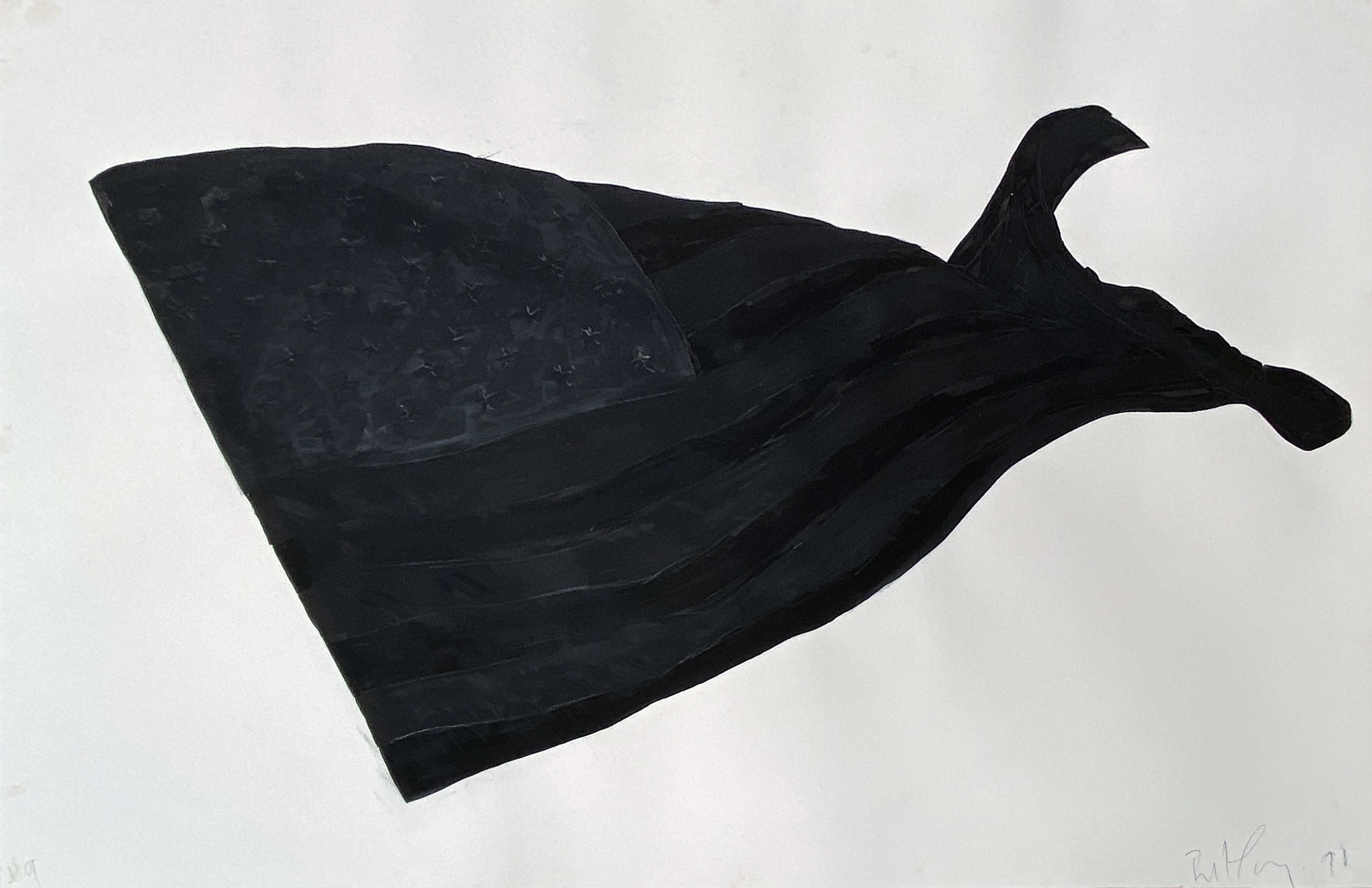 This monotype exemplifies Longo's mastery of dramatic black-and-white contrast, likely exploring themes of American iconography and political tension that define his broader practice. The work demonstrates his skillful adaptation of his signature high-contrast aesthetic to the intimate, hands-on medium of monotype printing.