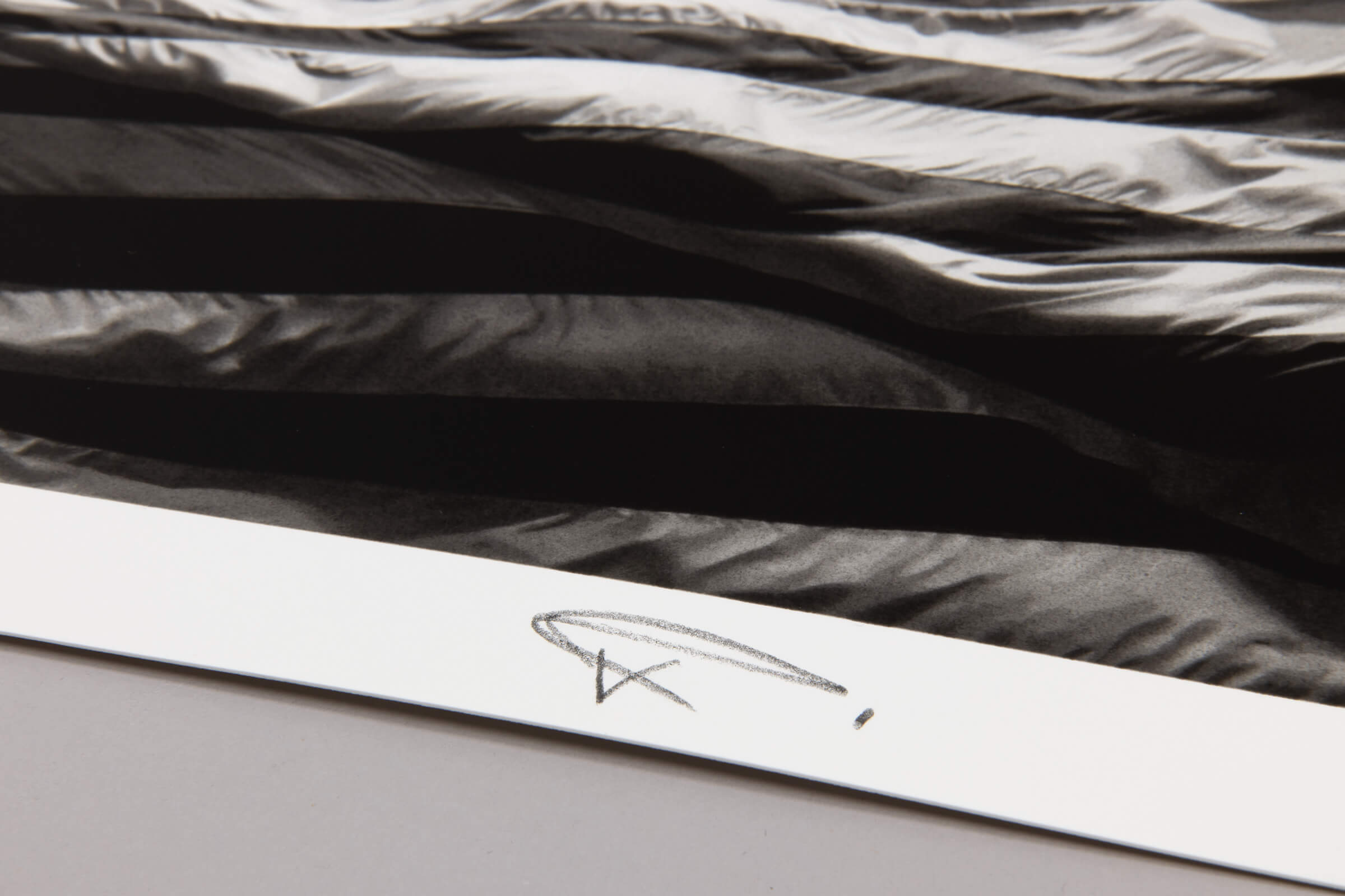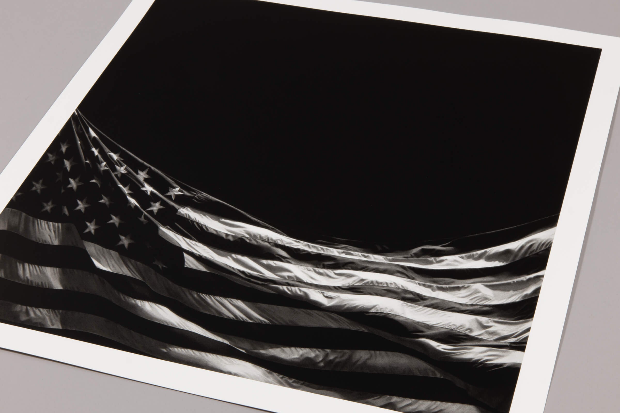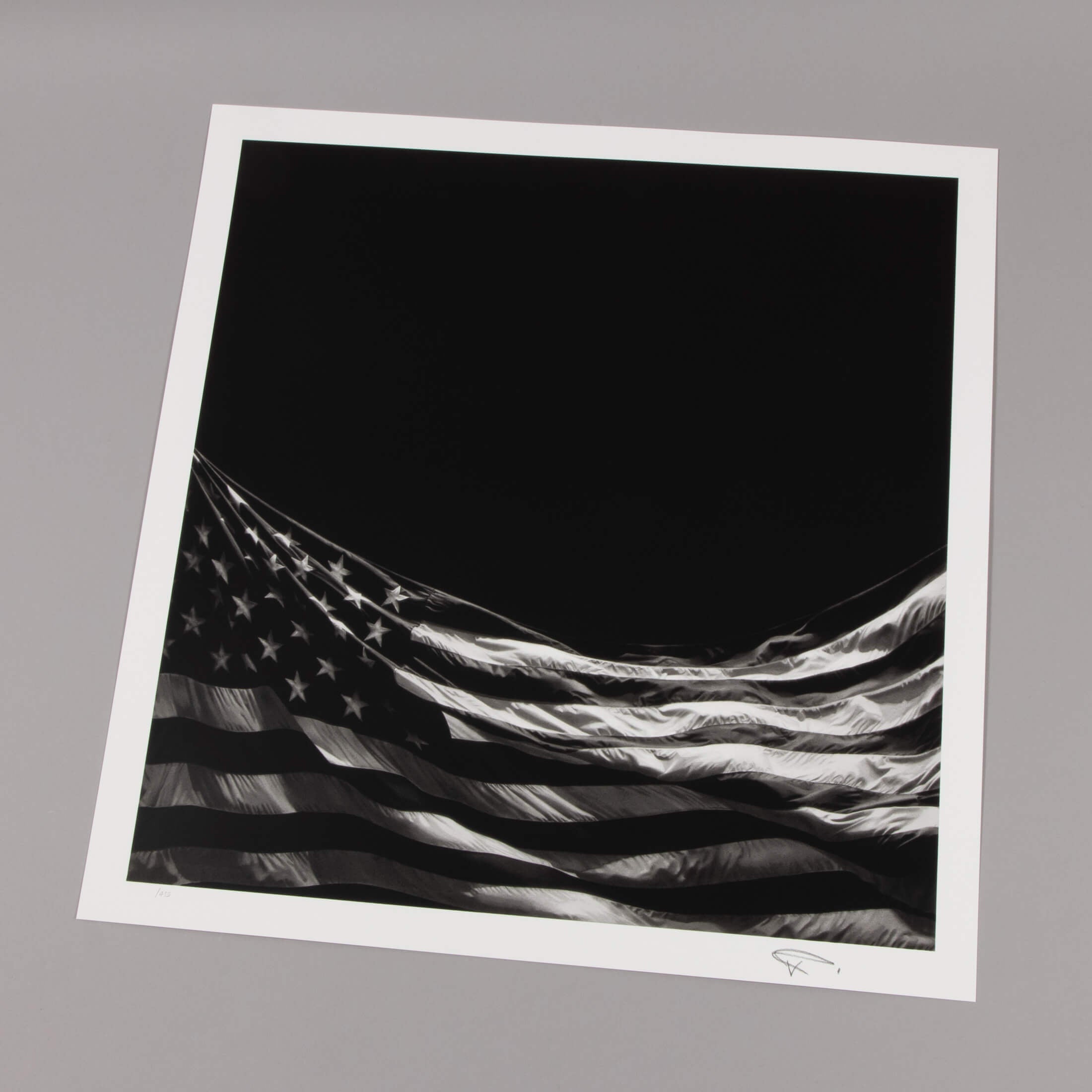 Robert Longo ’s Untitled (Falling Flag) is a signed limited edition print from 2025, featuring a dramatically rendered American flag set against a deep black void. The flag occupies only the lower portion of the composition, appearing to collapse or descend, while the surrounding darkness amplifies its symbolic tension. Produced as a screenprint with varnish on Somerset paper, the work captures the depth and texture of Longo’s charcoal-based imagery through complex grayscale layering. The intense black field functions as a conceptual space, suggesting absence, instability, and the fragility of power structures. A recurring motif in Longo’s practice, the American flag becomes here a charged symbol of democracy, protest, and contemporary political uncertainty. Issued in an edition of 415 and hand-signed and numbered, Falling Flag is a compelling example of contemporary political art .