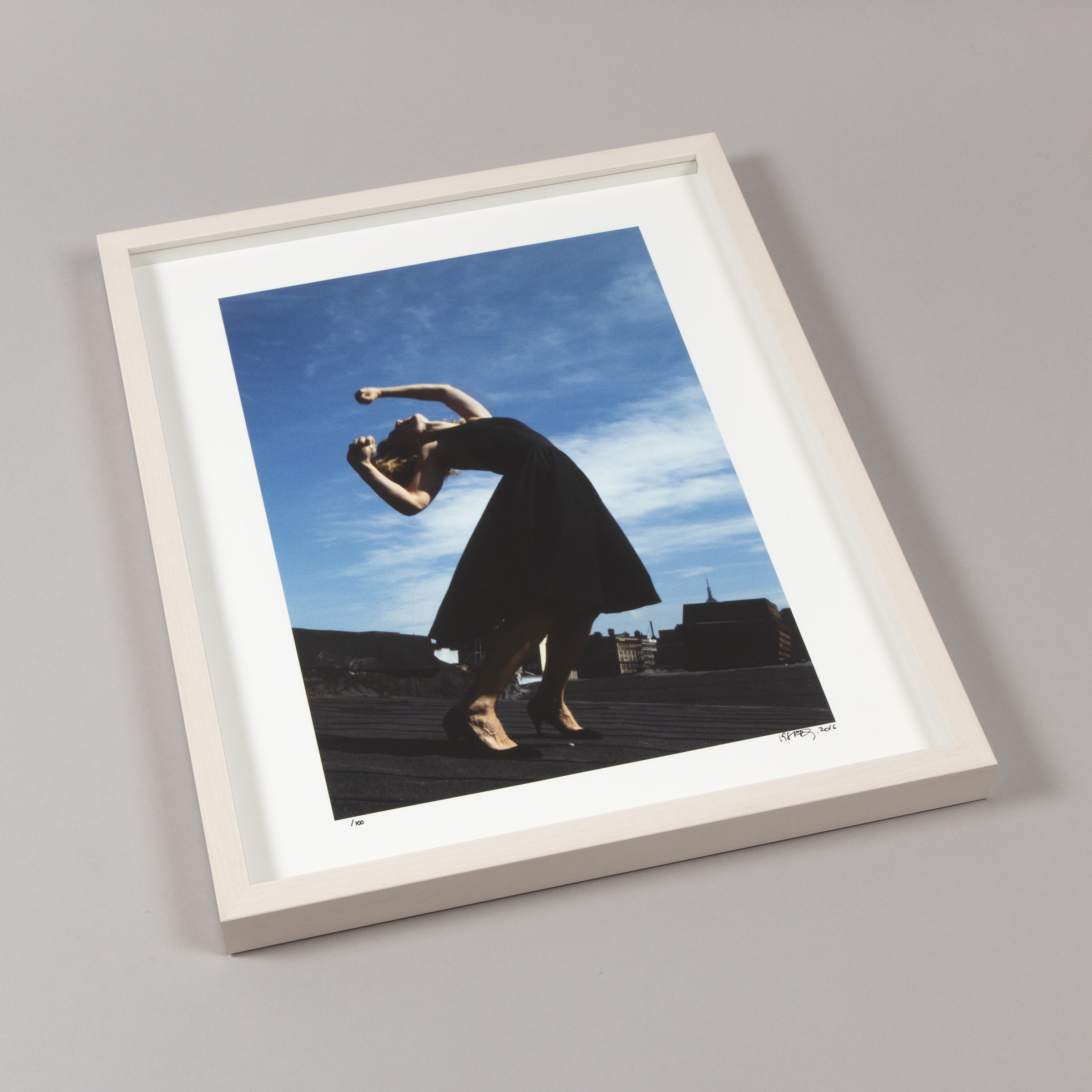 Robert Longo 's Janet (from Men in the Cities) is a limited edition archival pigment print presenting one of the defining images from his seminal Men in the Cities series. This photographic artwork captures a sharply dressed female figure suspended in a dramatic, contorted pose against an open sky, poised between composure and collapse. The image crystallizes a central tension in Longo's practice: the collision of control and chaos within the structures of modern urban life. Deeply influenced by film noir and 1970s political thrillers, Robert Longo was drawn to the expressive potential of bodies caught in moments of extreme tension. Rather than depicting literal violence, he sought to register psychological rupture through gesture. The series began with carefully staged photographs of friends, including Kevin Noble and Cindy Sherman, reenacting poses inspired by cinematic stills. In New York, Longo refined this method by choreographing abrupt shifts of balance and reaction, directing models into destabilized positions that created the illusion of impact. These photographs later served as source material for his monumental charcoal drawings, yet they also stand independently as fully resolved artworks. Photographed in 1981 and published in 2016 in a limited edition of 100 plus 20 artist's proofs, Janet (from Men in the Cities) is hand-signed, dated, and numbered by the artist, underscoring the lasting significance of Longo's photographically based artworks and prints within contemporary art.