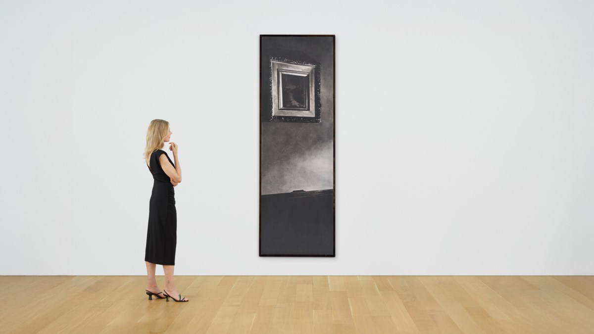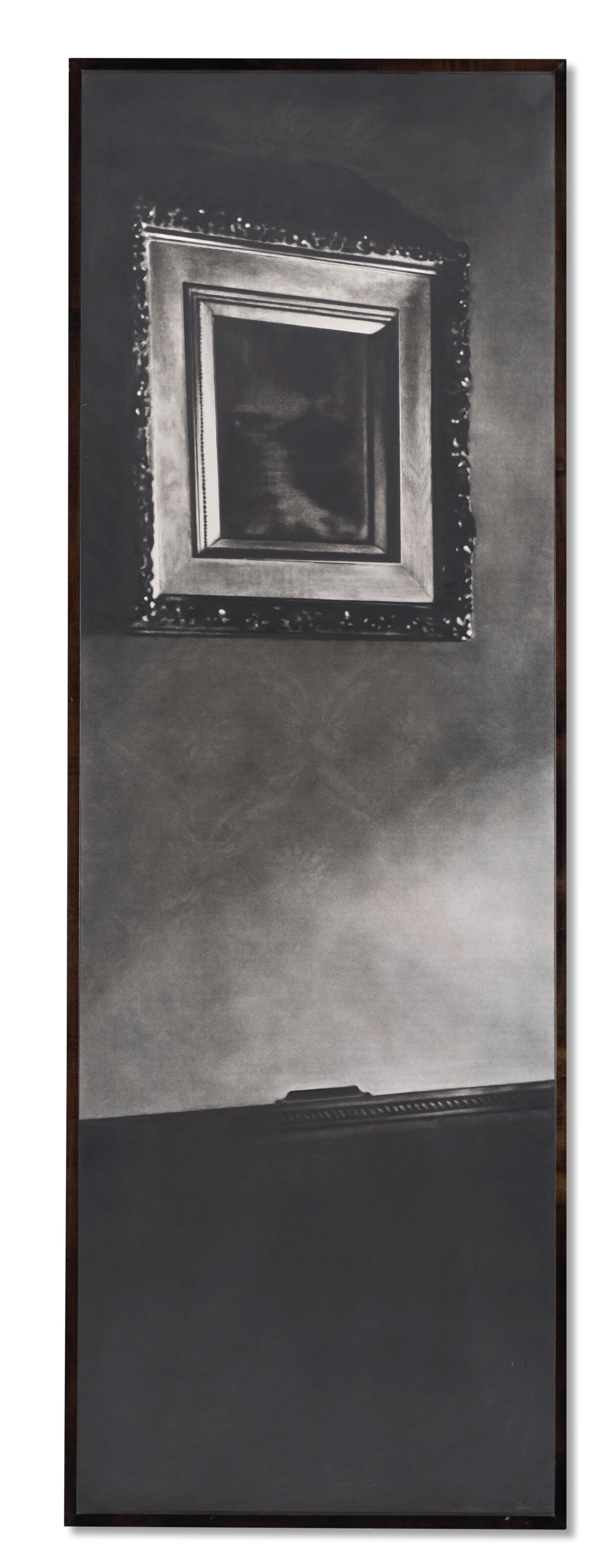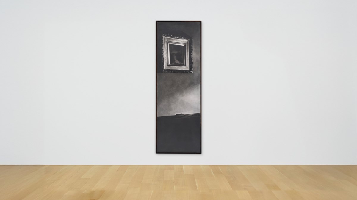 Robert Longo's monumental charcoal drawing renders a vintage picture frame and sitting room interior with his signature hyperrealistic precision, transforming an intimate domestic scene from 1938 into a striking study of memory and absence. The richly textured black-and-white composition captures every shadow and detail with cinematic intensity, blurring the boundary between drawing and photography. Longo further complicates questions of representation by enclosing the work within an artist's frame, creating a layered meditation on containment, looking, and the act of framing itself.