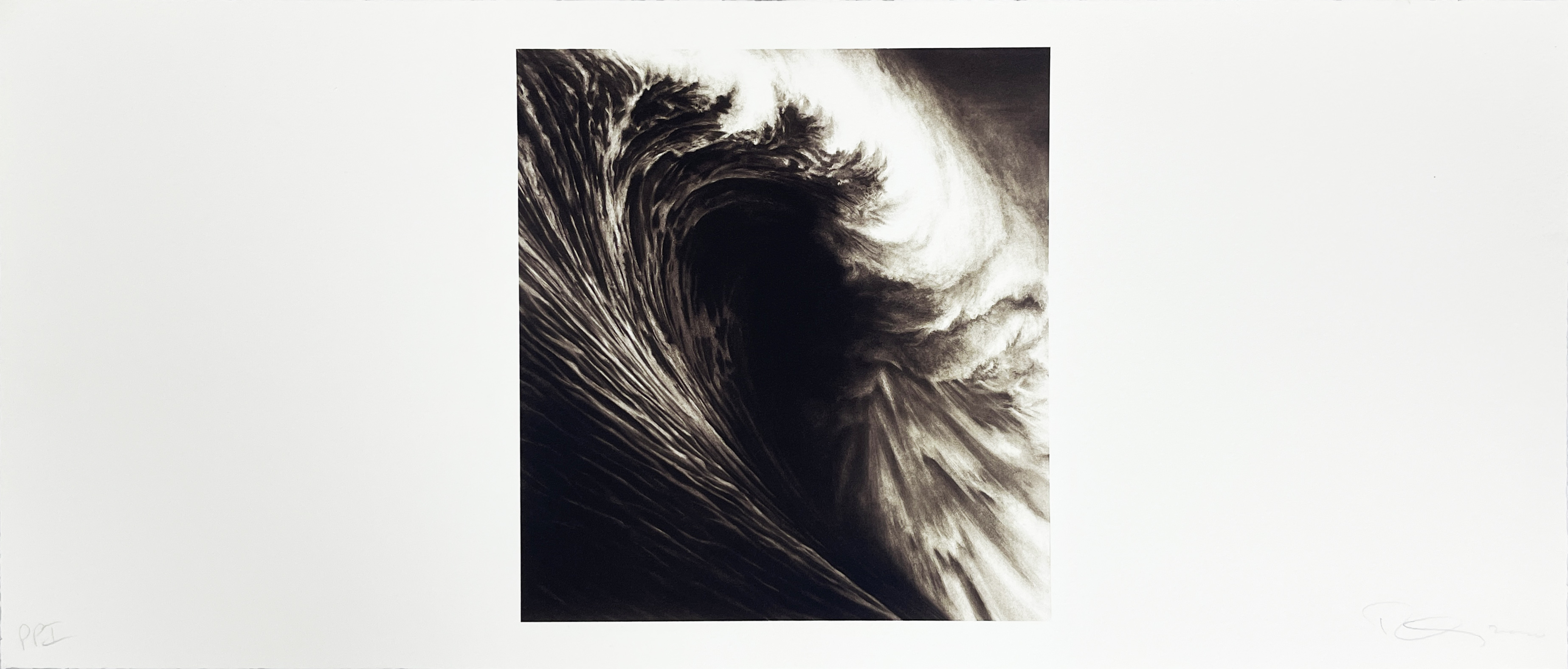 This lithograph exemplifies Longo's signature dramatic realism, capturing the raw power of an ocean wave through his masterful use of black and white tonal contrasts. Part of his exploration of natural forces, the work demonstrates his ability to translate monumental subjects into intimate print form while maintaining the psychological intensity characteristic of his broader oeuvre.