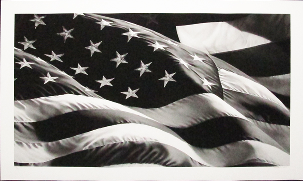 This large-scale archival pigment print exemplifies Longo's masterful use of dramatic black-and-white imagery to transform familiar American iconography into powerful political statements. Part of his ongoing exploration of power and nationalism, the work renders the flag with his characteristic hyperrealistic technique that oscillates between photography and drawing.