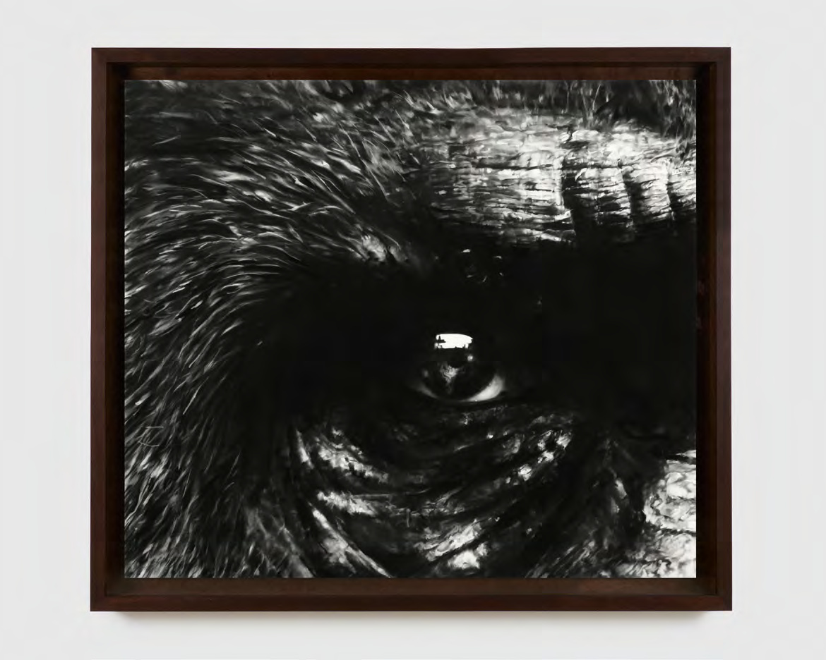 This hyperrealistic charcoal drawing presents an intensely detailed close-up of a gorilla's eye, rendered with extraordinary technical precision. The work exemplifies Longo's mastery of the medium, capturing the raw power and intelligence conveyed through animal portraiture. The monochromatic charcoal technique emphasizes dramatic contrasts and psychological intensity. The close-up framing transforms the animal subject into a meditation on presence and consciousness. This work continues Longo's exploration of power dynamics through intimate observation.