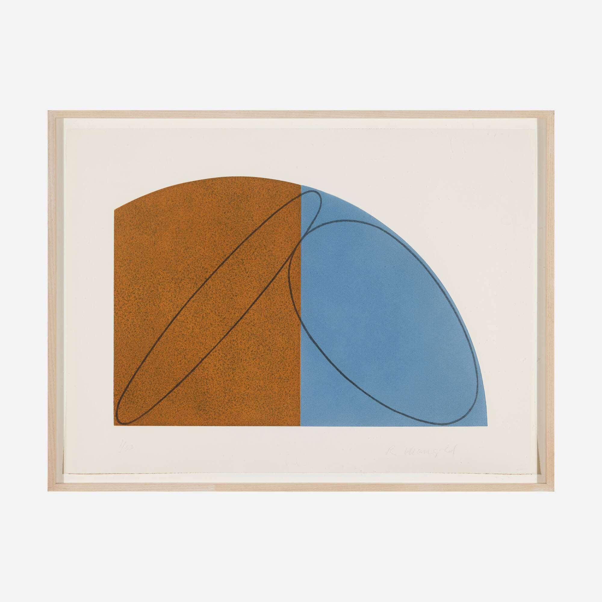 This etching and aquatint by Robert Mangold was created in 1995 as a benefit print for Artists Space, a nonprofit exhibition venue in New York. The work demonstrates Mangold's characteristic interest in geometric abstraction, utilizing subtle color fields and precise linear elements. Printed on Arches paper, the piece showcases the rich tonal qualities achievable through the aquatint process combined with etching. The composition reflects his long standing exploration of form, proportion, and restrained color relationships.