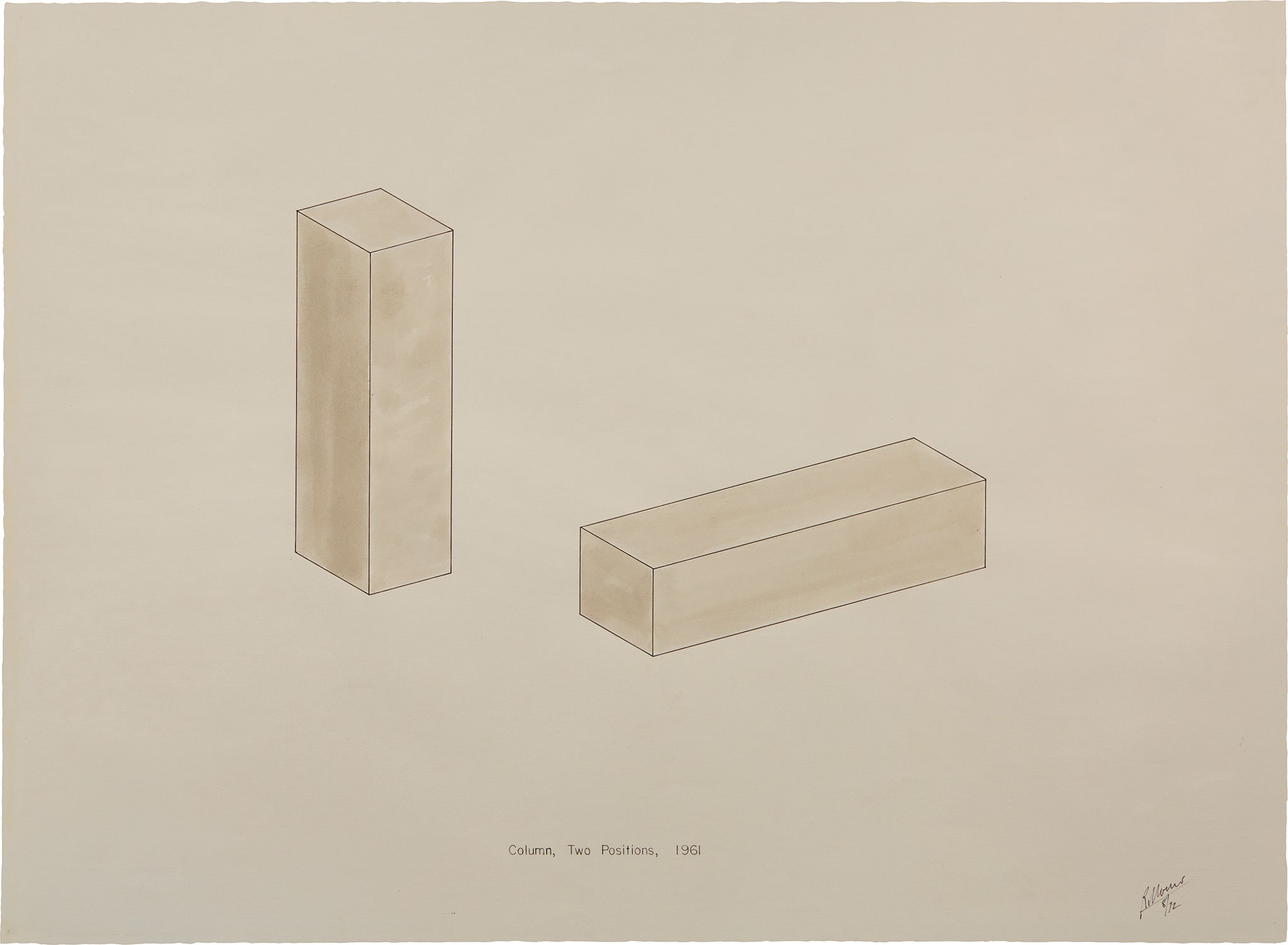 Robert Morris's 1972 drawing uses ink and ink wash on paper to depict Column, Two Positions from 1961. This work documents the artist's conceptual and minimalist sculptural practice through drawing.