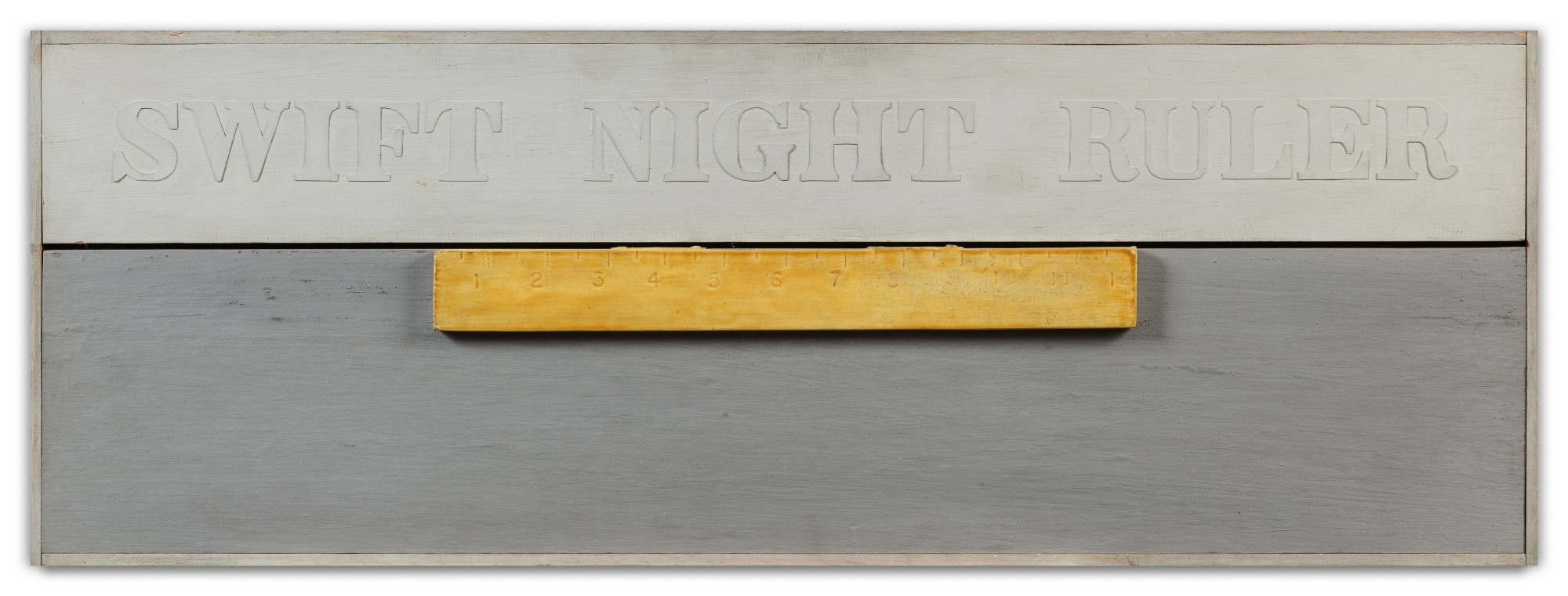 Robert Morris's 'Swift Night Ruler' (1963) is constructed from painted wood and cardboard, reflecting the artist's minimalist and conceptual approach. The work exemplifies Morris's exploration of materiality and geometric form in the early 1960s.