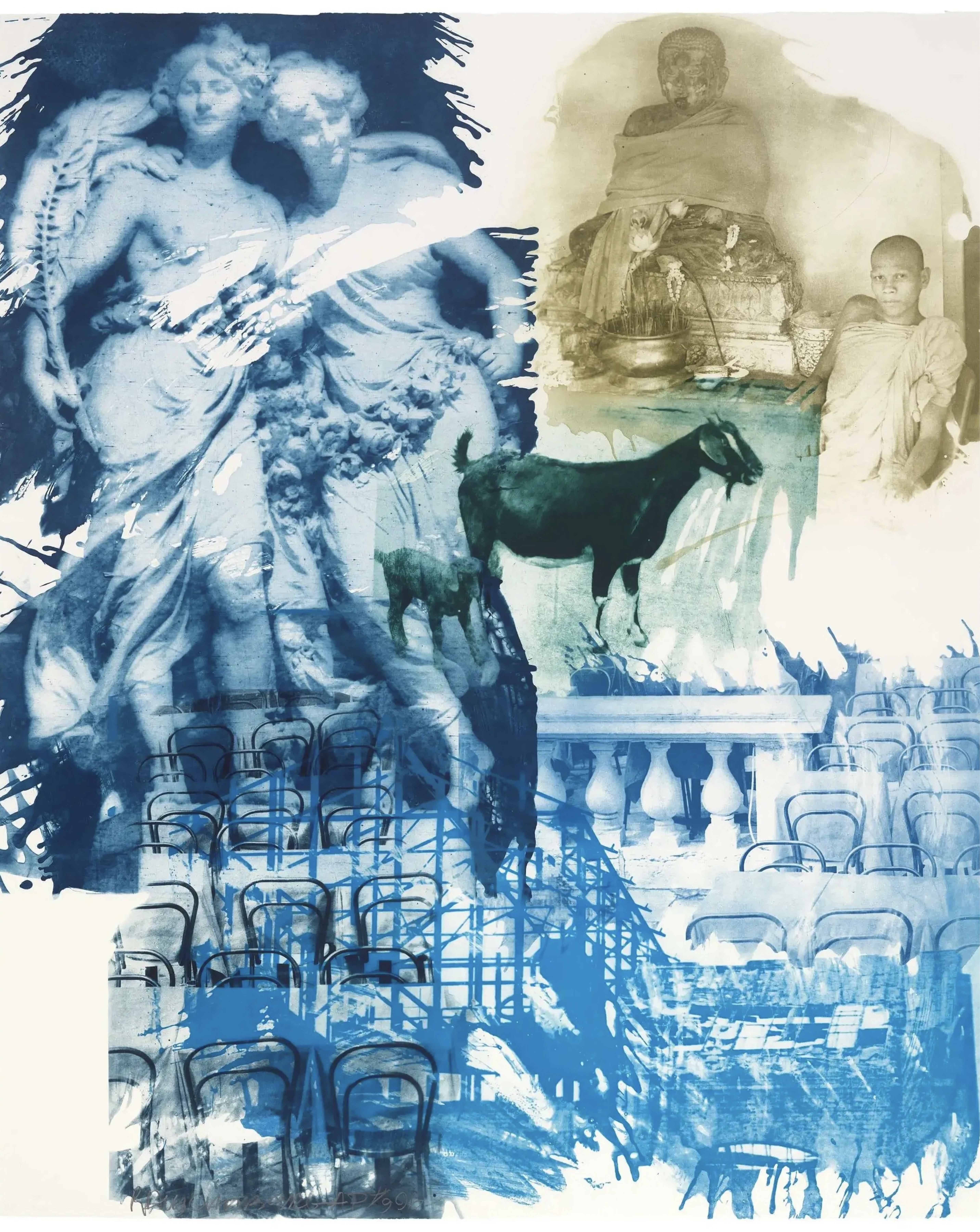 A large-format cyanotype by Robert Rauschenberg featuring his characteristic multi-image collage approach, combining classical sculptural figures, a sepia-toned photograph of Buddhist monks, a dark goat silhouette, a balustrade, and rows of Thonet bentwood chairs, rendered in vivid Prussian blue tones with expressive brushstroke overlays. The work exemplifies Rauschenberg's lifelong exploration of combining found photographic imagery from disparate cultural sources — Western, Eastern, animal, and architectural — into a unified pictorial field. Cyanotypes were a central medium in his later career, particularly following his work with the process in the 1990s–2000s. This piece would be of significant interest to collectors focused on Rauschenberg's photographic and process-based works.