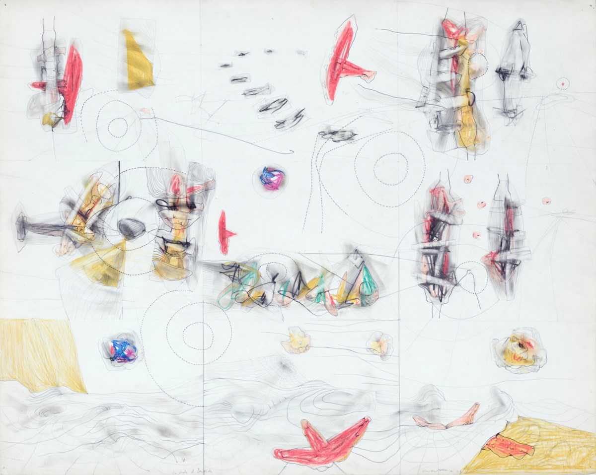 A swirling composition of vibrant pastels and delicate graphite lines conjures an otherworldly interior space, where ambiguous forms and biomorphic shapes drift between figuration and abstraction. Matta's characteristic surrealist vocabulary fills the paper with pulsating energy, evoking a psychological landscape torn between certainty and uncertainty. The interplay of bold color and subtle pencil work creates a sense of tension and flux, as if consciousness itself is being mapped in real time.
