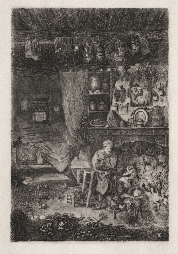 Intimate domestic life unfolds through extraordinarily detailed etching work, where every surface and texture receives Bresdin's obsessive attention to create an almost hyperreal interior scene.