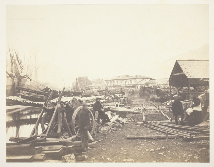 Military supplies and equipment crowd this bustling harbor scene, documenting the massive logistical operation required to sustain British forces during one of photography's first wars.