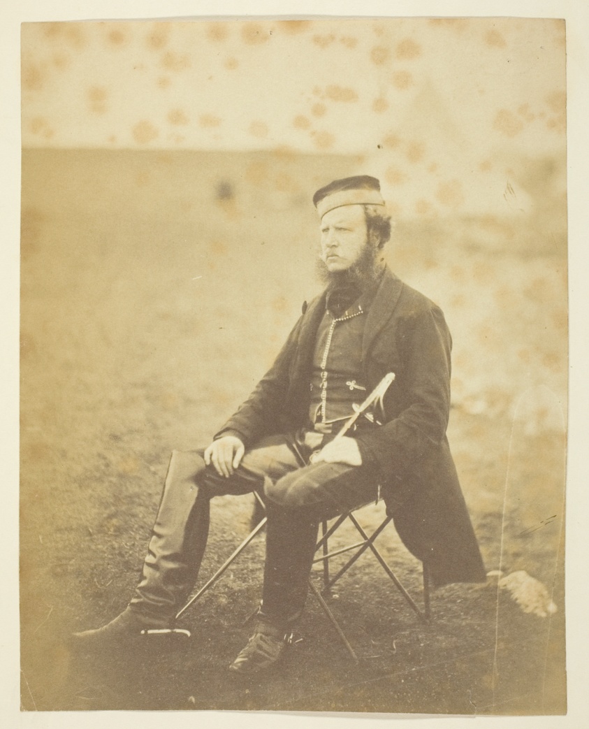 Among the first war photographers in history, Fenton captured this dignified portrait of a British general during the Crimean conflict, using the newly developed albumen print process that allowed for sharp detail and tonal richness.