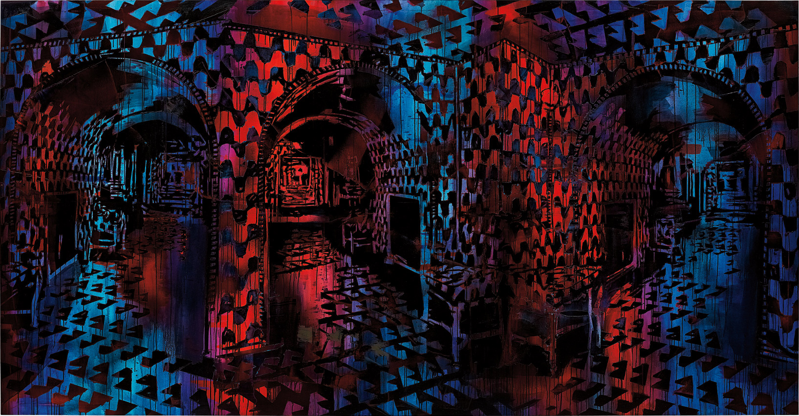 A sprawling, large-scale painting by Rosson Crow, "Choices We Must Make" layers acrylic and oil on canvas to create a theatrical, atmosphere-drenched interior saturated with bold color and frenetic energy. Crow's signature style floods the composition with ornate architectural details, ghostly figures, and kaleidoscopic hues that blur the line between glamour and decay. The work evokes a sense of psychological tension, inviting viewers to navigate its chaotic, densely layered narrative.