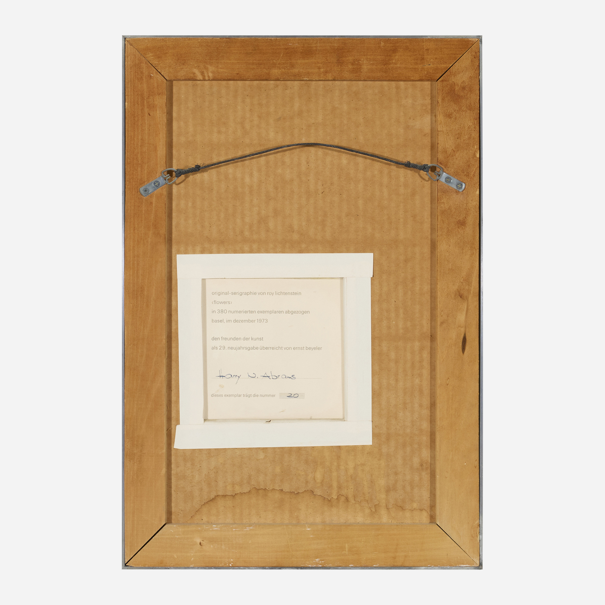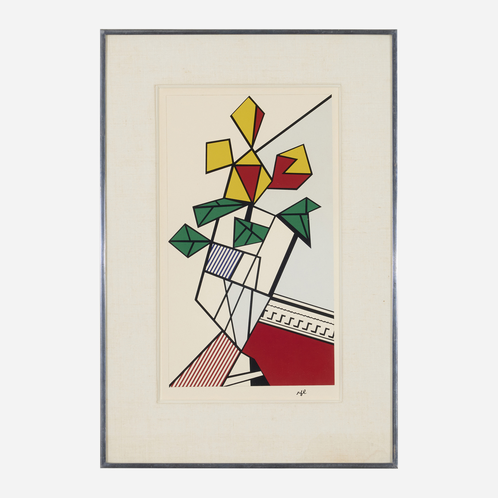 This 1973 screenprint features vibrant flowers rendered in Roy Lichtenstein's distinctive pop art style. The composition employs bold outlines and primary colors characteristic of the artist's graphic approach. The floral subject matter is presented with the same mechanical precision typically reserved for commercial design. The work exemplifies Lichtenstein's ability to elevate everyday imagery into fine art through his innovative printing technique.