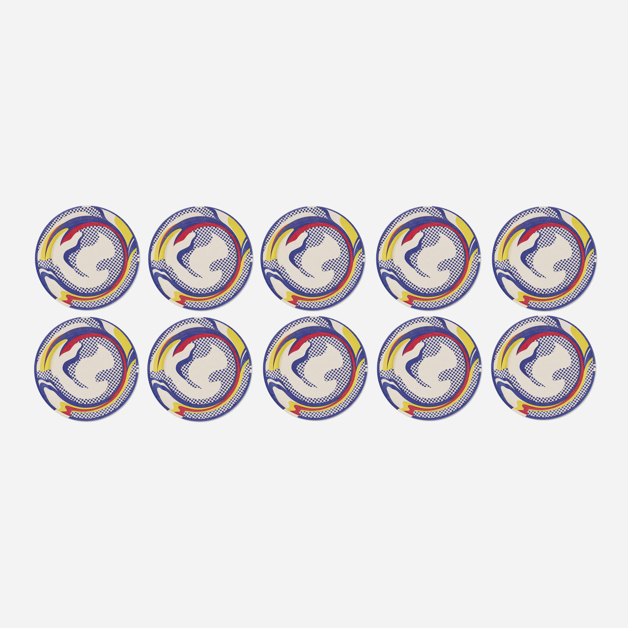 Printed to verso of each work 'Roy Lichtenstein © On 1st Inc. 1969'. These works are from the edition of unknown size published by Bert Stern for his store On 1st, New York in conjunction with the exhibition Roy Lichtenstein: Ceramic Sculpture held 21 February - 20 March 1977 at California State University, Long Beach. Sealed in original plastic packaging.