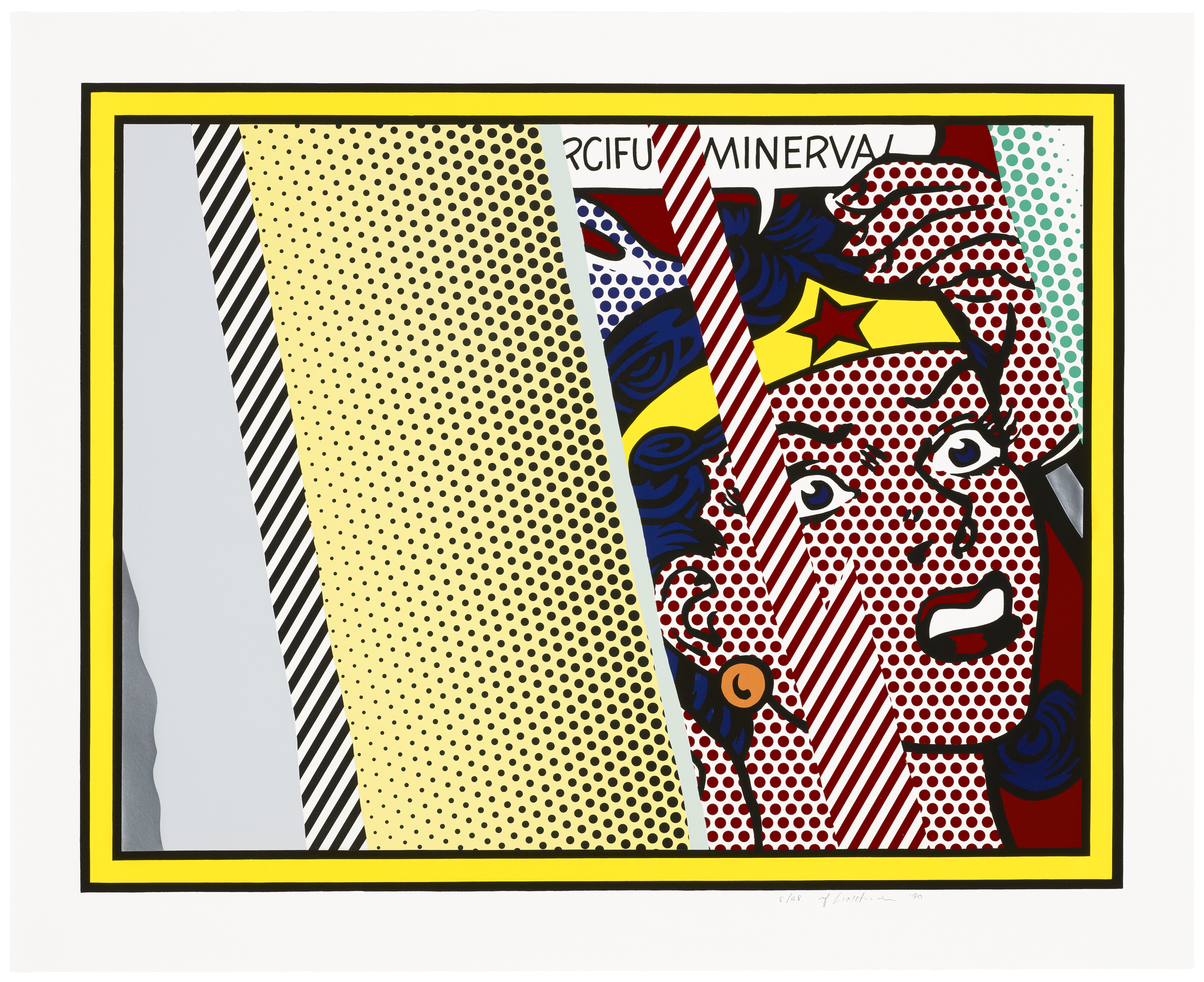 This lithograph exemplifies Lichtenstein's late-period exploration of reflective surfaces, combining his signature Ben-Day dots with innovative metalized PVC collage to create shimmering optical effects. Part of his acclaimed Reflections series, the work references classical antiquity through Minerva while showcasing the artist's technical mastery of multiple printmaking processes on handmade paper.