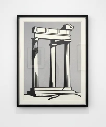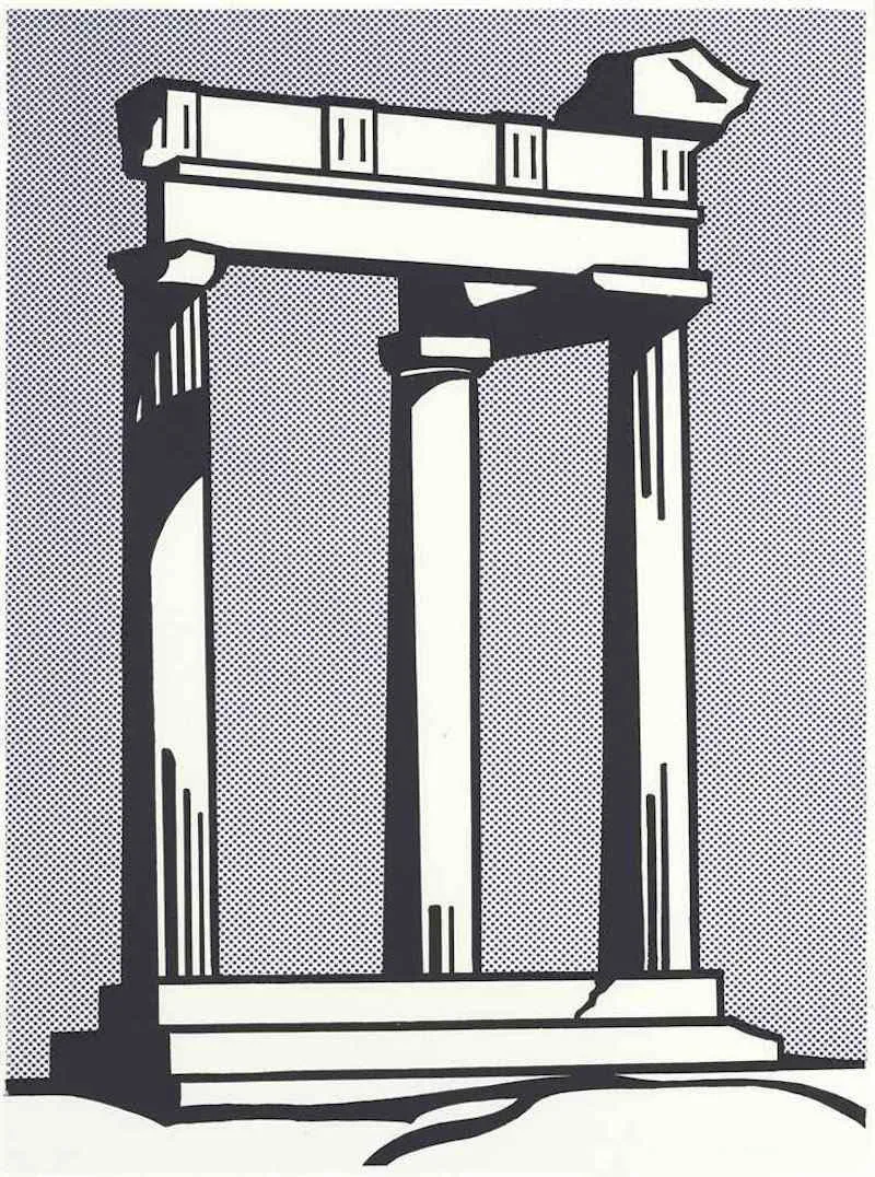 An exhibition poster featuring Lichtenstein's characteristic comic book aesthetic and bold geometric forms. The work exemplifies his Pop Art approach to transforming commercial art techniques into fine art.