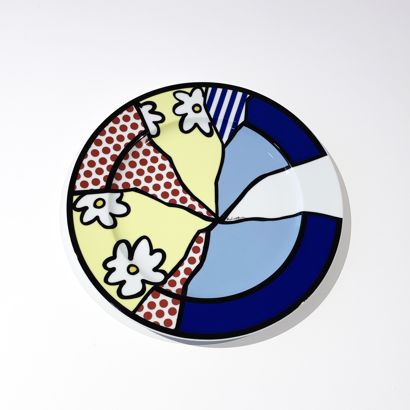 This ceramic plate represents Lichtenstein's exploration of decorative arts through his signature Ben-Day dot technique, applying his pop art aesthetic to Monet's iconic water lily motif. The work demonstrates the artist's continued engagement with art historical references while expanding his practice beyond traditional canvas into functional objects during his late career.