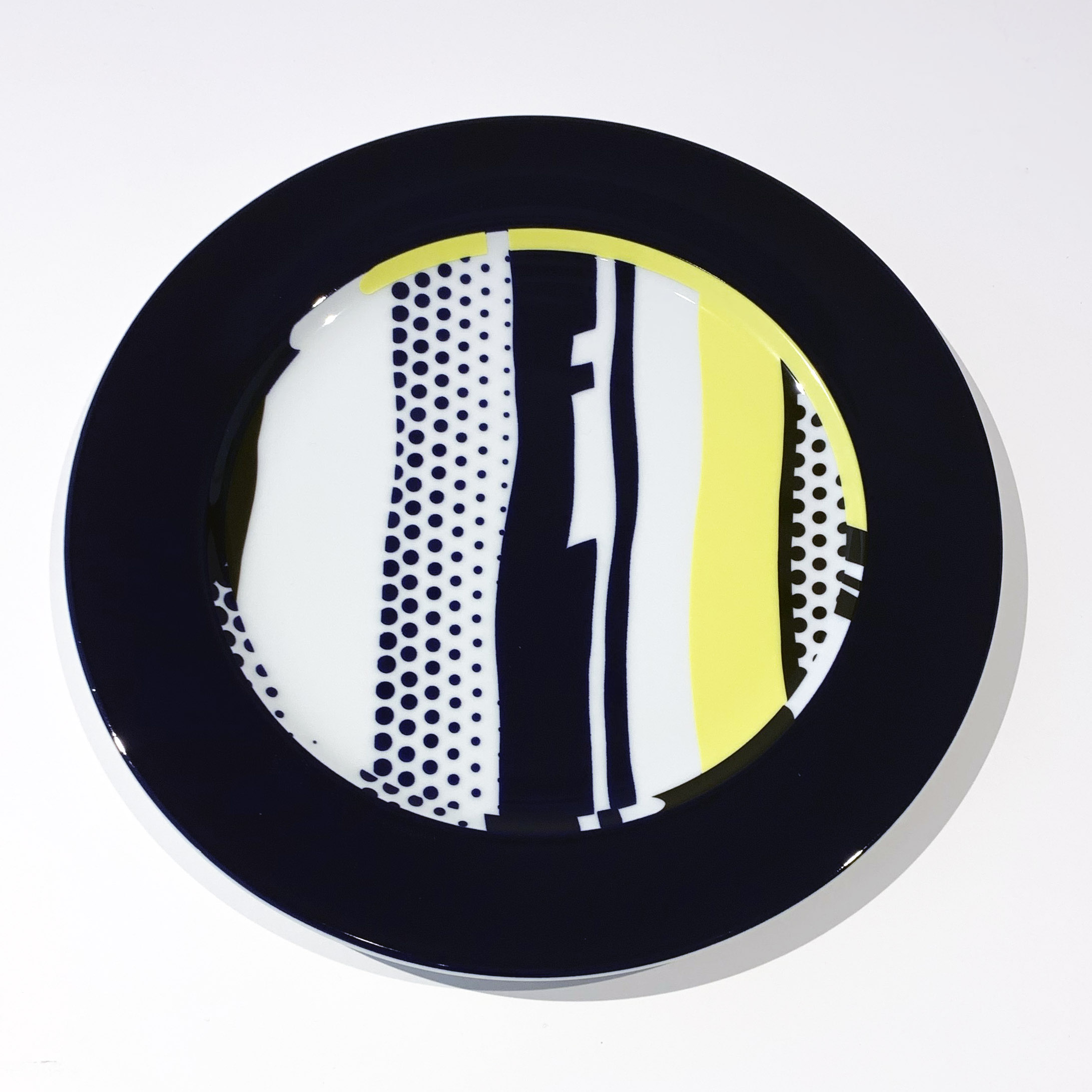 This rare porcelain plate demonstrates Lichtenstein's exploration of commercial design and functional art objects late in his career, translating his signature Pop Art aesthetic onto decorative ceramics. Part of a limited collaboration with prestigious German manufacturer Rosenthal, the work extends his investigation of mass production techniques beyond traditional printmaking into applied arts.