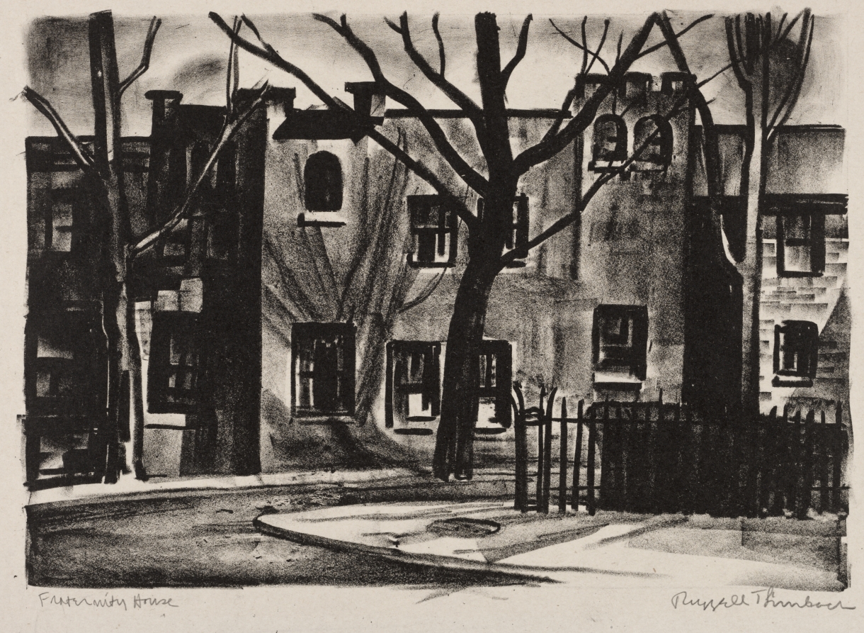 Capturing American collegiate life during the Roaring Twenties, Limbach's lithograph documents the social architecture of student culture with sharp observational detail.