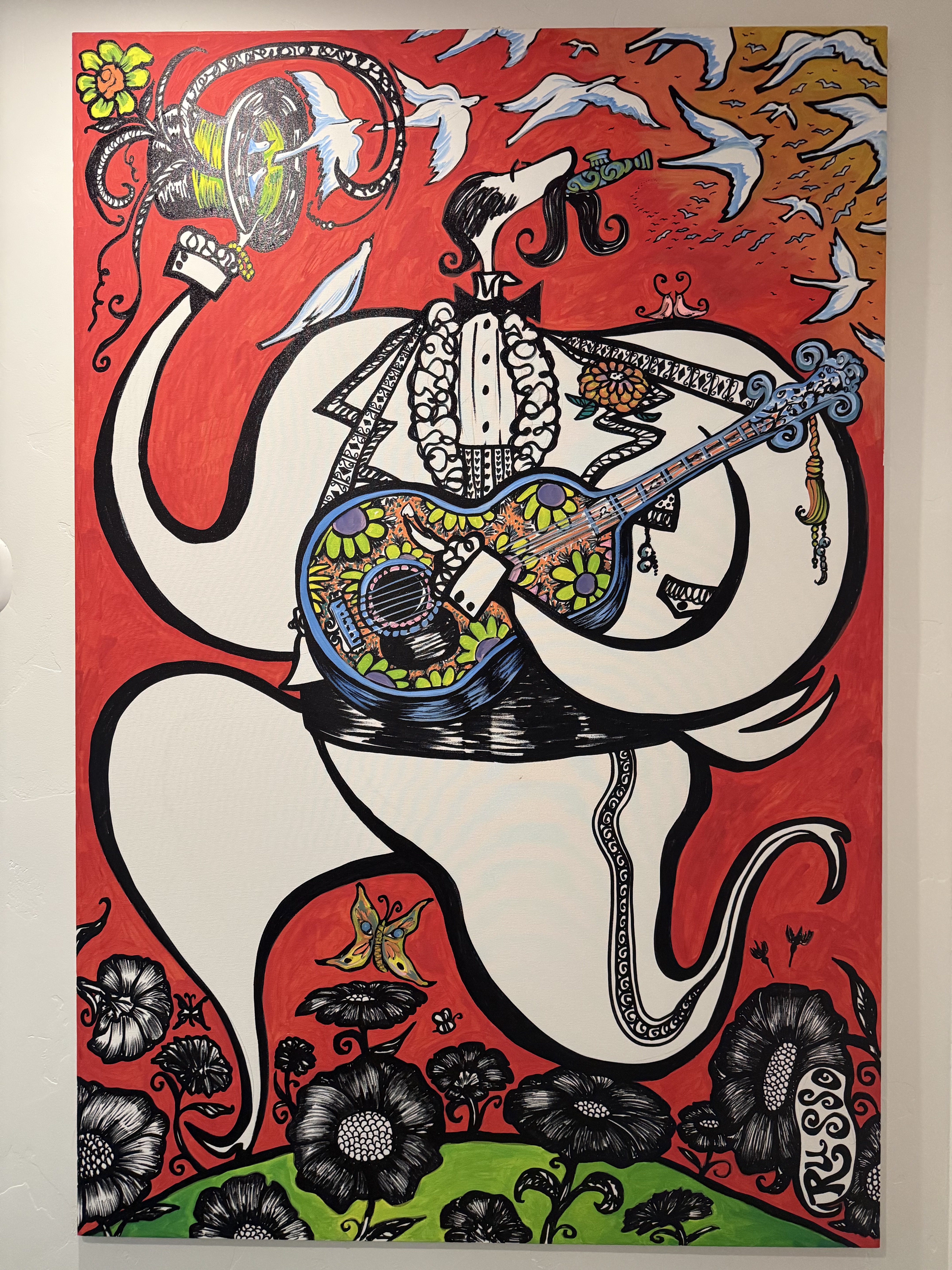 A large-scale, vibrantly colored canvas by the artist Russo, featuring a surrealist composition of a white elephant-like figure playing an ornately decorated guitar, set against a bold red background with birds, flowers, and a butterfly. The work is executed in a bold graphic style with heavy black outlines and vivid fills of red, green, blue, and yellow, reflecting influences of street art, folk art, and psychedelic imagery. Acquired at the AIDS Project Los Angeles (APLA) Art Project Los Angeles charity benefit auction on June 30, 2012, catalogued as lot 301 under the working title 'Named On Completion,' with a pre-sale estimate of $15,000. The work was purchased by collector Jonathan B. Murray for $2,600, alongside pieces by Keith Haring and Helen Frankenthaler, underscoring the cultural and philanthropic significance of its provenance.