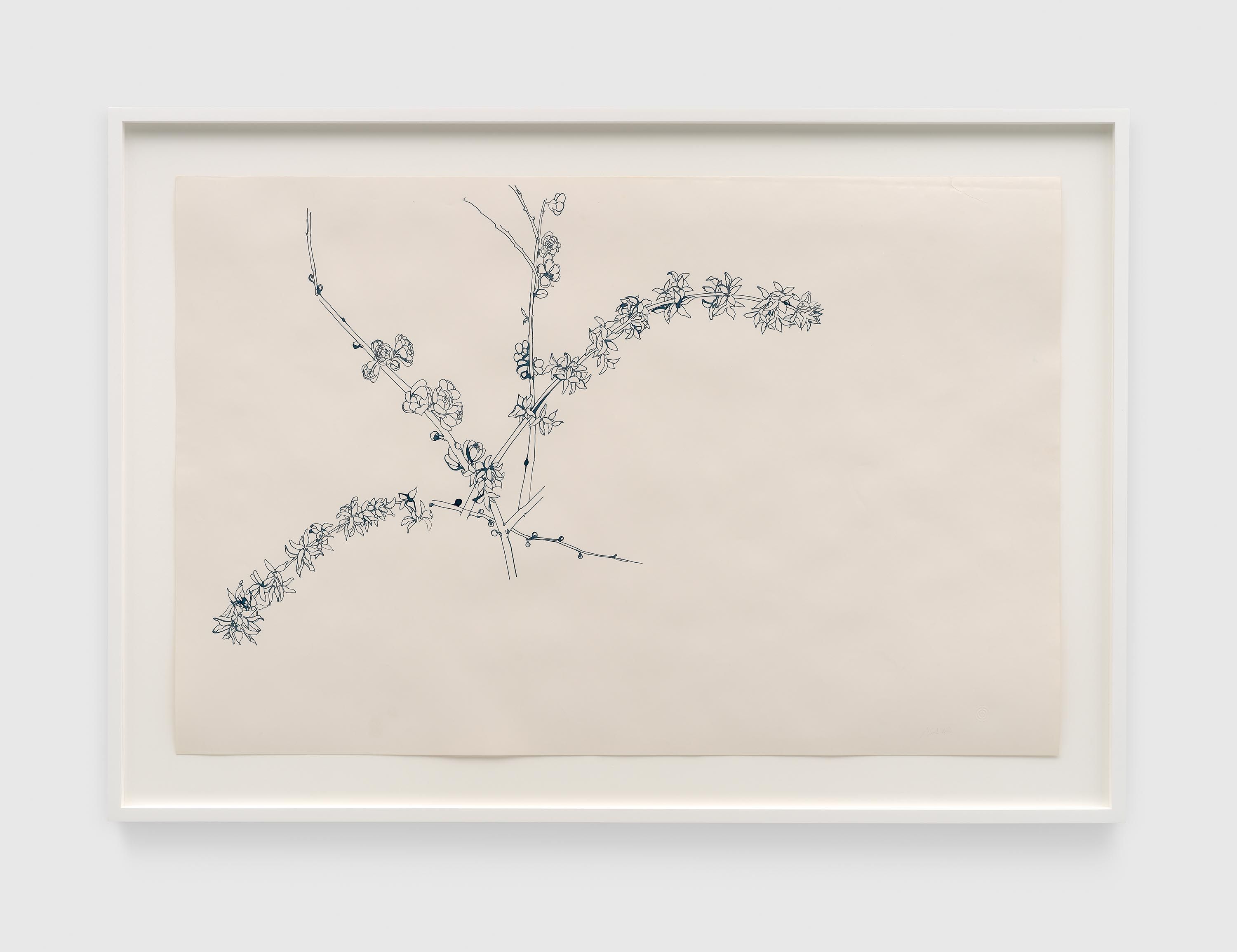 A detailed ink drawing featuring flowering quince rendered with Asawa's signature fluid linework and botanical precision. The composition captures the organic beauty of flowering plants through expressive line work.